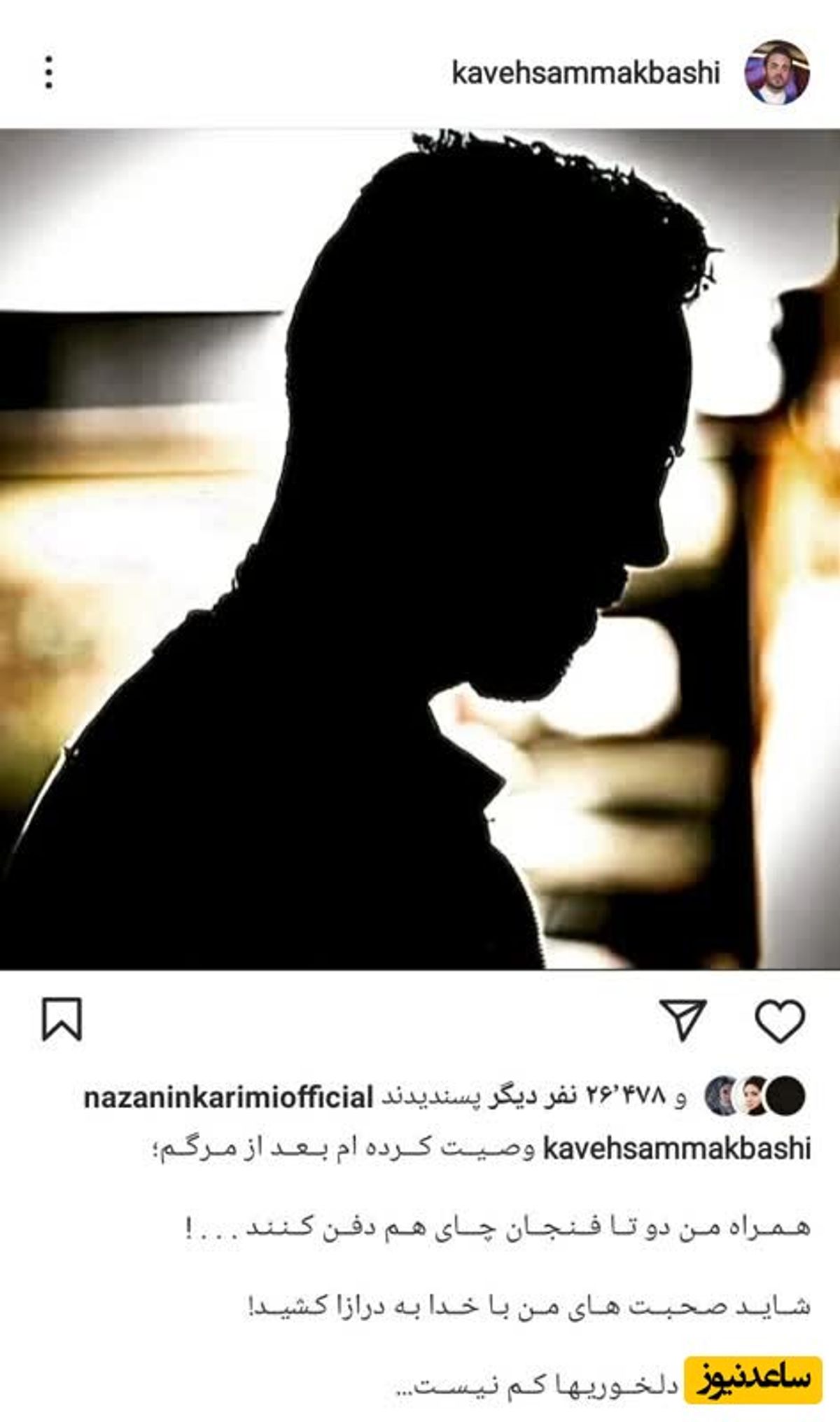 کاوه سماک باشی بازیگر 40 ساله کشورمان در خانواده این هنرمند زاده شده است.او فرزند ارشد خانواده است و تنها یک خواهر کوچک تر به نام تارا دارد. استوریی از وصیت این بازیگر را ببینید.