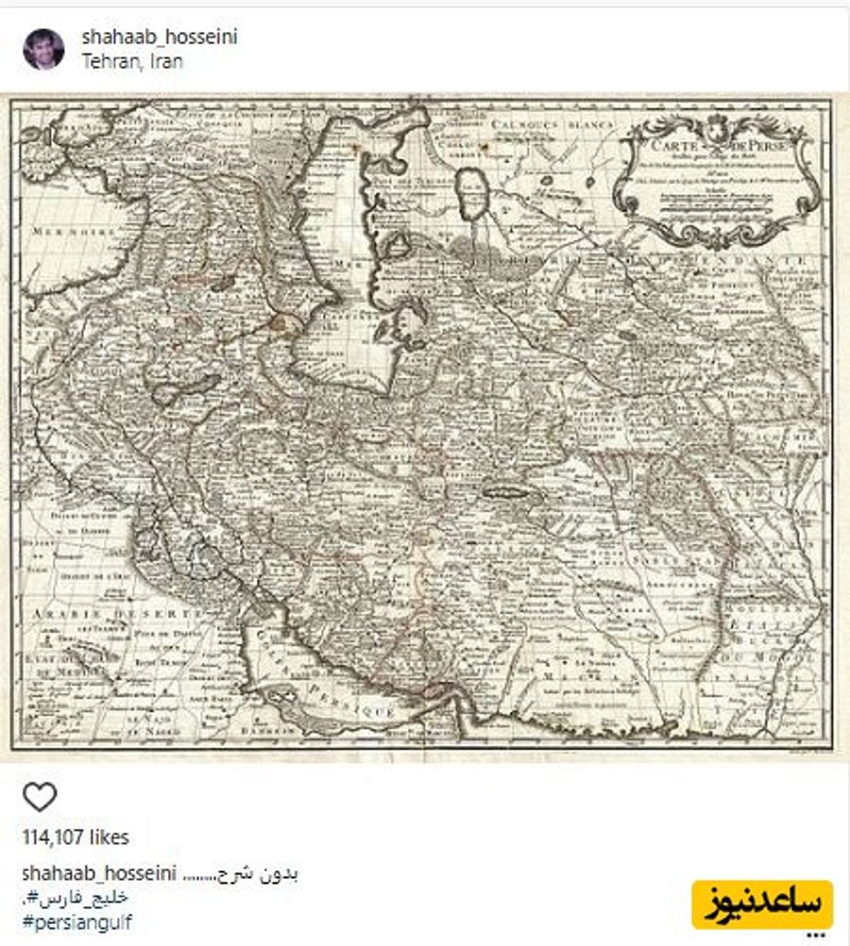 شهاب حسینی بازیگر برنده جایزه جشنواره کن تصویری از یک نقشه قدیمی در اینستاگرام منتشر کرد که به خوبی نام خلیج فارس بر آن دیده میشود. او هشتگ «خلیج فارس» را به اشتراک گذاشت و نوشت: «بدون شرح»