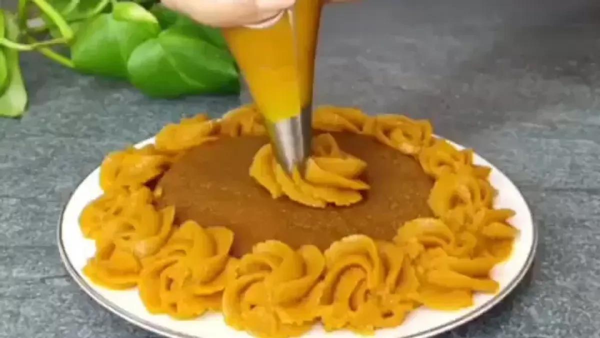 در این مرحله حلوا را به صورت گهواره ای درون تابه تکان می دهیم تا از دیواره های تابه جدا شود. در نهایت حلوا را درون ظرف مورد نظرمان می ریزیم و روی آنرا به سلیقه خود با حلوای پایپ شده تزیین کرده و سرو می کنیم.