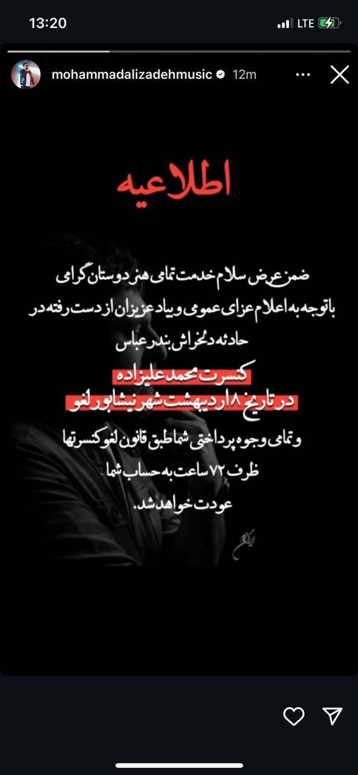 محمد علیزاده، در پی اعلام عزای عمومی برای حادثه اندوهناک بندرعباس، از لغو شدن کنسرتش خبر داد.