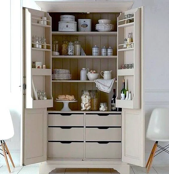 - اگر کابینت های شما کوچک، کم تعداد است شما نباید تمام وسایل خود را در کابینت ها قرار دهید و می توانید برخی از وسایل را بر روی کانتر، روی یخچال، روی قفسه های دیوار قرار دهید.
