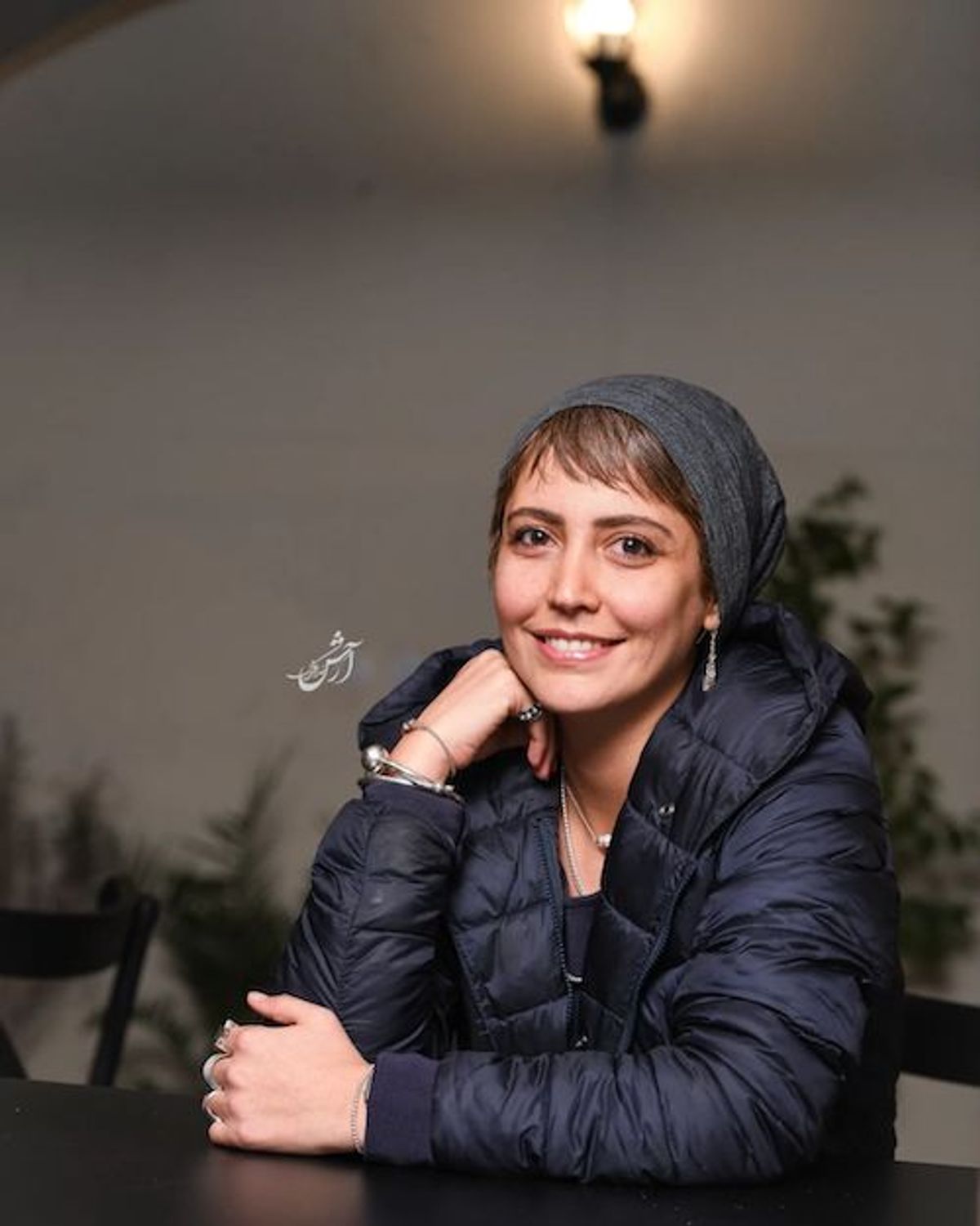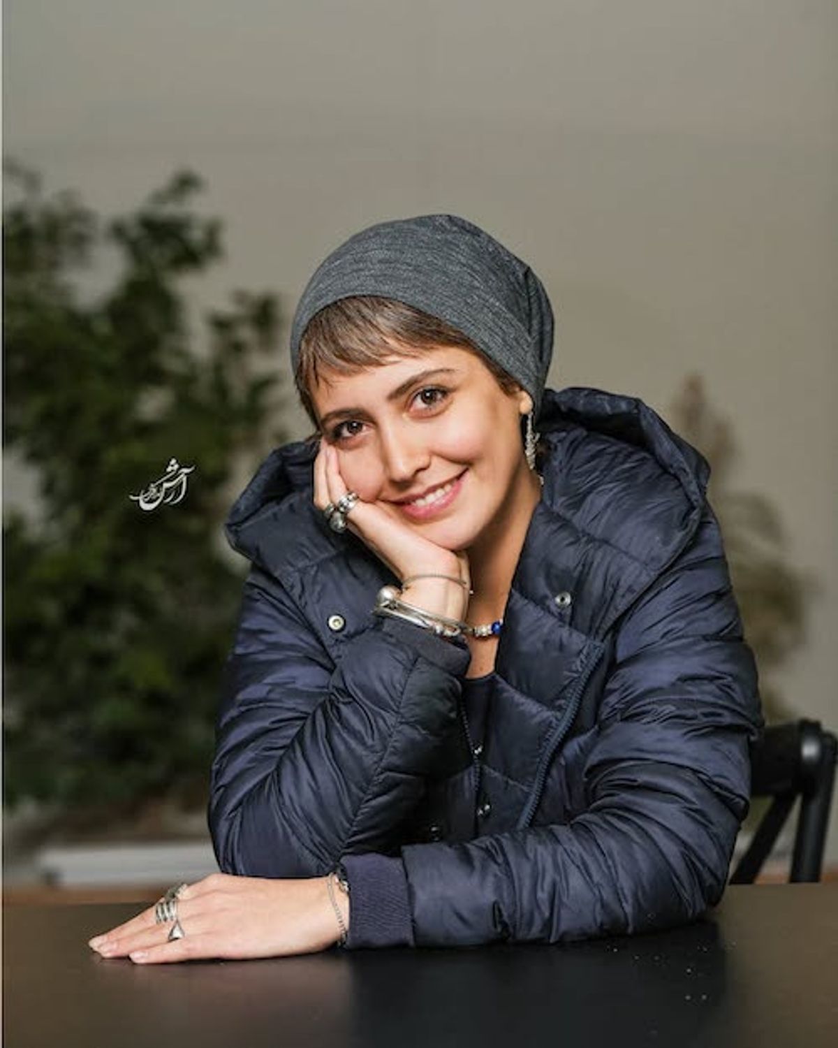 استایل گرم و شیک شبنم قربانی با پافر بنفش و سربند طوسی| تیپ جذاب شبنم قربانی با موهای چتری و گوشوارههای آویز و انگشترهای شاخص
