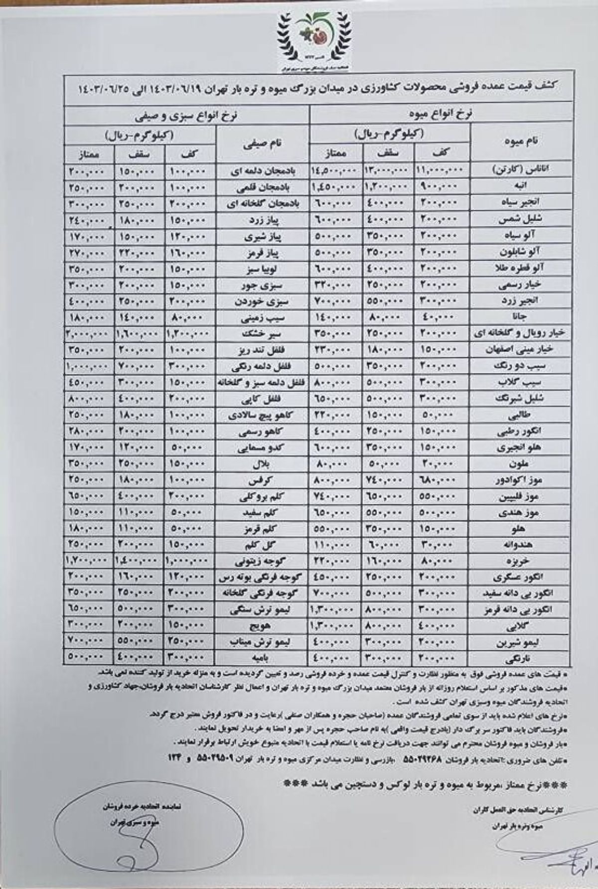 قیمت عمده محصولات کشاورزی (میوه و صیفیجات) برای هفته جاری ۱۹ تا ۲۵ شهریور ۱۴۰۳ از سوی میدان بزرگ میوه و تره بار تهران اعلام شد.