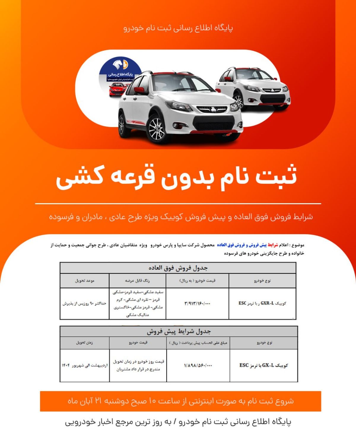 اعلام شرایط پیش فروش و فروش فوق العاده محصول شرکت سایپا و پارس خودروهای کوئیک GXR-L و GX-L از ویژه متقاضیان عادی، جوانی و جمعیت و حمایت از خانواده و طرح جایگزینی خودروهای فرسوده زمان شروع ثبت نام ساعت 10 صبح روز قبل دوشنبه 21 آبان تا زمان تکمیل ظرفیت و موعد تحویل این 90 روزه، اردیبهشت 1404 شهریور است.
