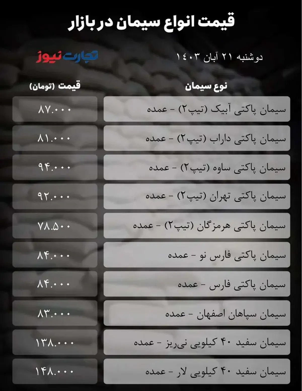 قیمت سیمان امروز دوشنبه ۲۱ آبان ۱۴۰۳| بازار سیمان از تنش قیمتی به دور ماند+ جدول