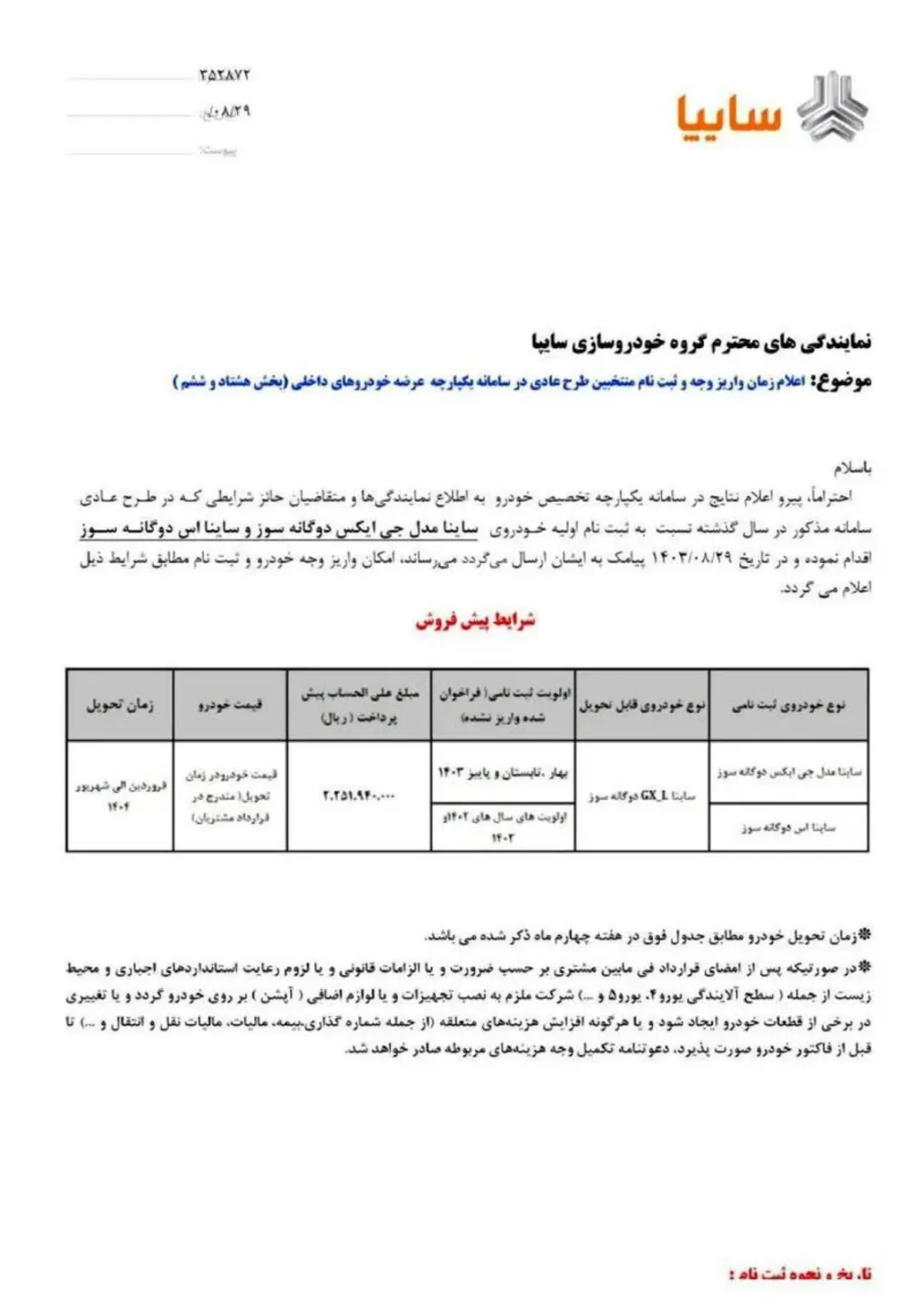 پیش فروش یک خودرو سایپا با قیمت جدید آغاز شد. شرایط پیش فروش ساینا ویژه آبان 1403 اعلام شد.