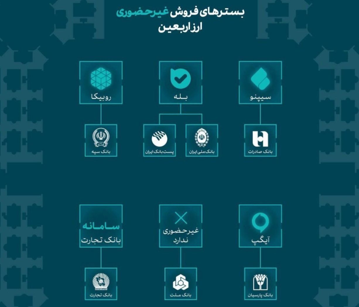 همچنین مقرر است بانک پارسیان خدمت غیرحضوری عرضه ارز اربعین را دربستر پیامرسان «آیگپ» ارائه کند که پس از نهایی شدن از طریق وبسایت رسمی بانک پارسیان اطلاعرسانی خواهد شد. قابل ذکر است؛ بانک تجارت خدمات غیرحضوری خود در این زمینه را در بستر سامانه این بانک ارائه خواهد داد که متقاضیان میتوانند نحوه دریافت این خدمات را از طریق سامانه بانک تجارت پیگیری کنند. لازم به توضیح است بانک ملت در ایام اربعین حسینی خدمات غیرحضوری در زمینه عرضه اربعین نخواهد داشت.