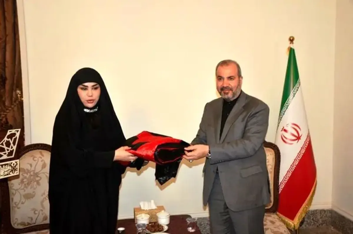 «امطار رحیم المیاحی» معاون رئیس هیئت عالی رسانه و ارتباطات عراق با تقدیر از «سحر امامی» مجری شبکه خبر، پرچم حرم مطهر اباعبدالله الحسین «ع» و لوح تقدیر از وی را به محمدکاظم آل صادق سفیر جمهوری اسلامی ایران در عراق تقدیم کرد .