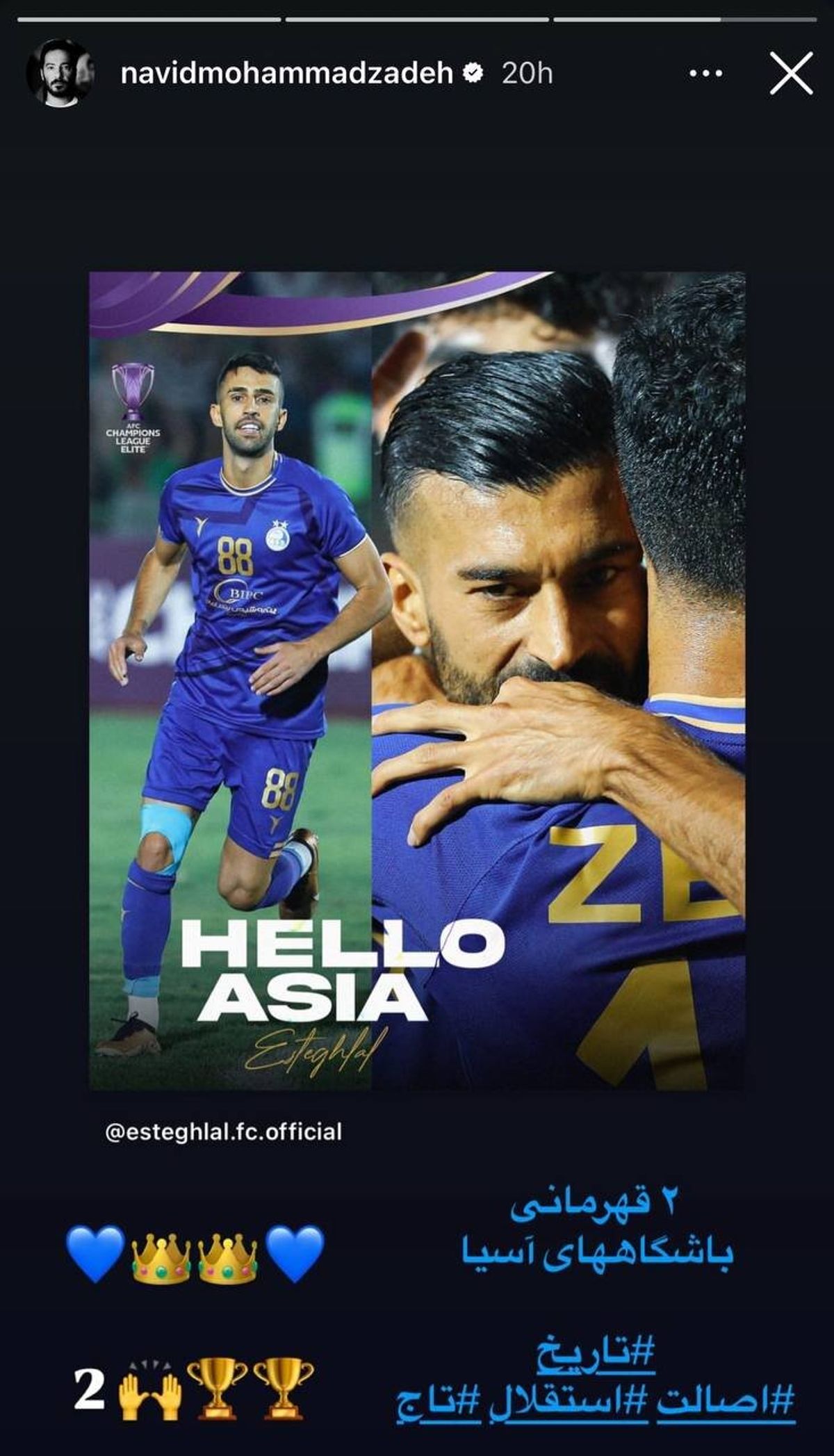 نوید محمدزاده، بازیگر سینما که همیشه از علاقه شدید خود به استقلال صحبت کرده، پس از برد این تیم با انتشار یک استوری، 2 قهرمانی آبیها در آسیا را به رخ رقبا کشید.