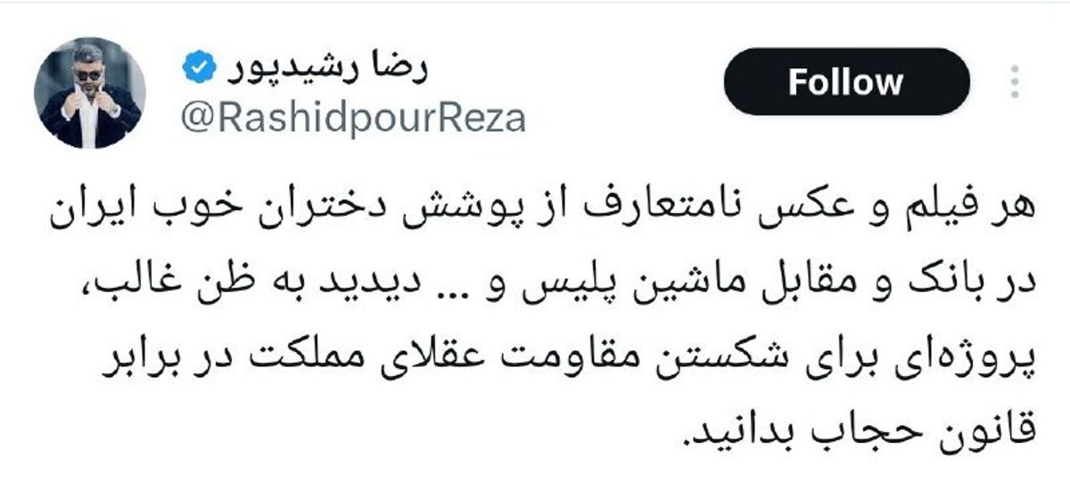رضا رشیدپور در واکنش به انتشار یک ویدیو از شهر اصفهان نوشت: عکس و فیلم نامتعارف از پوشش دختران پروژه ای برای شکستن مقاومت عقلای مملکت در برابر قانون حجاب است.