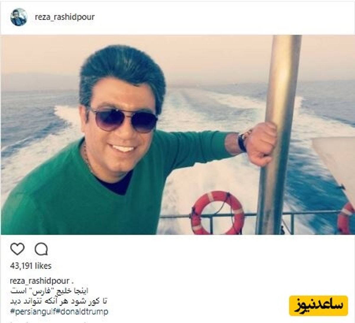 رضا رشیدپور مجری برنامه «حالا خورشید» نیز تصویری از خودش روی آبهای خلیج فارس منتشر کرد و نوشت: «اینجا خلیج فارس است. تا کور شود هر آنکه نتواند دید.»