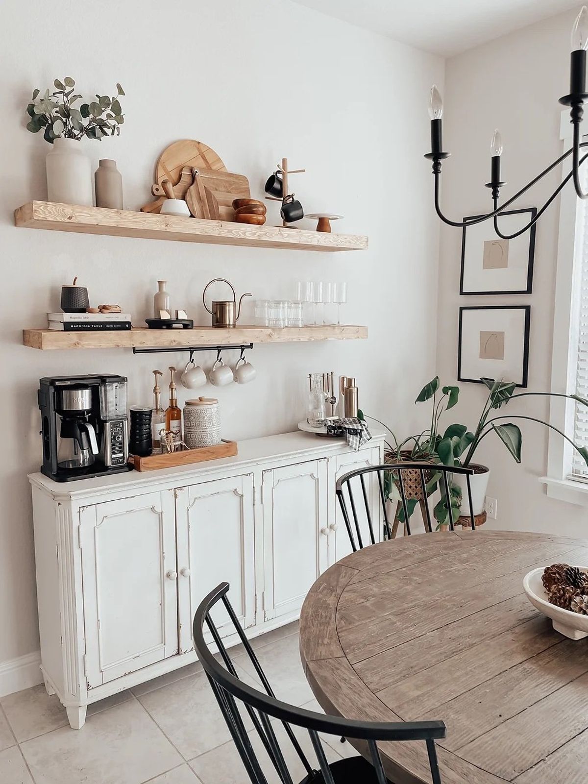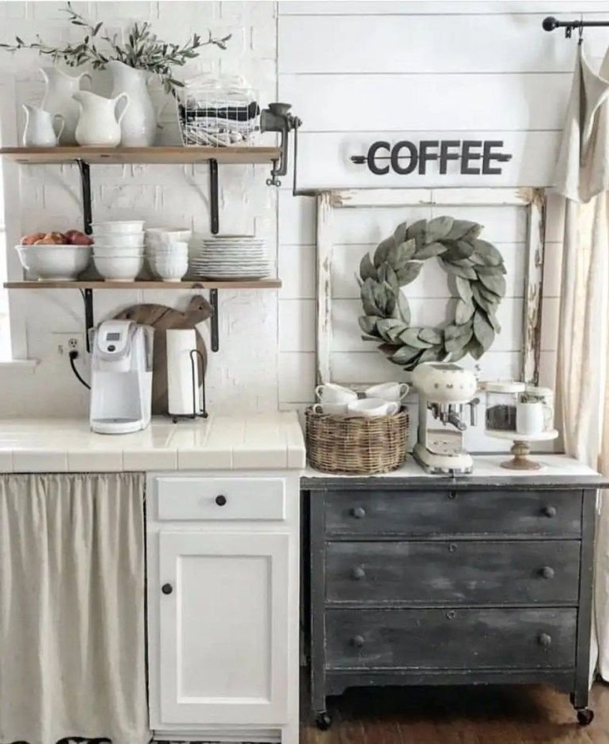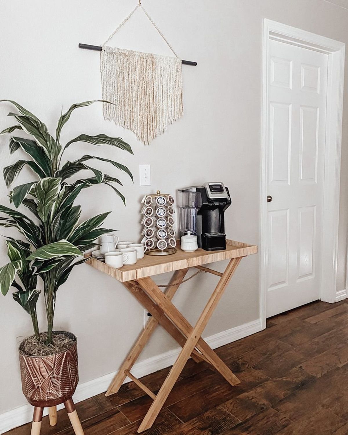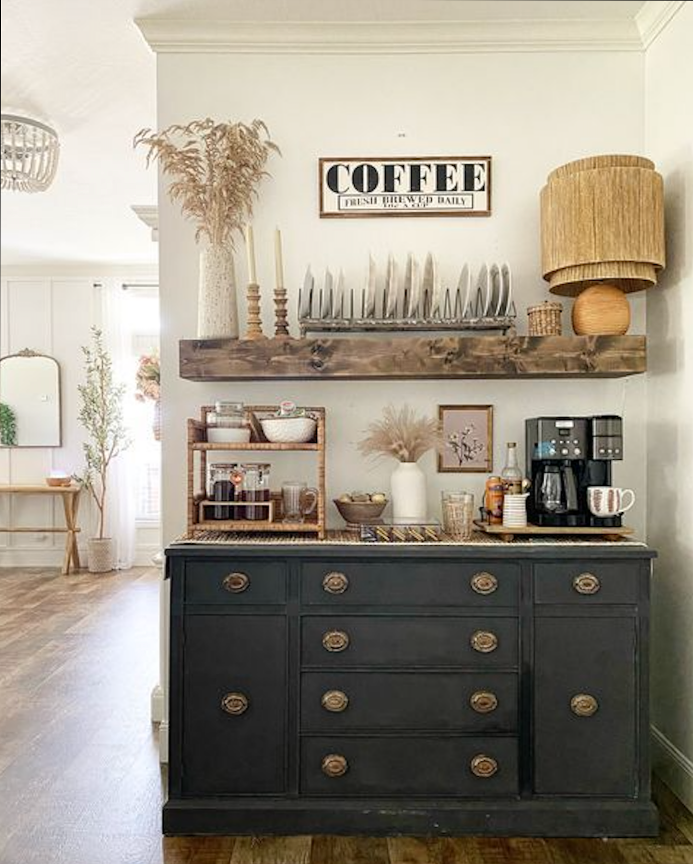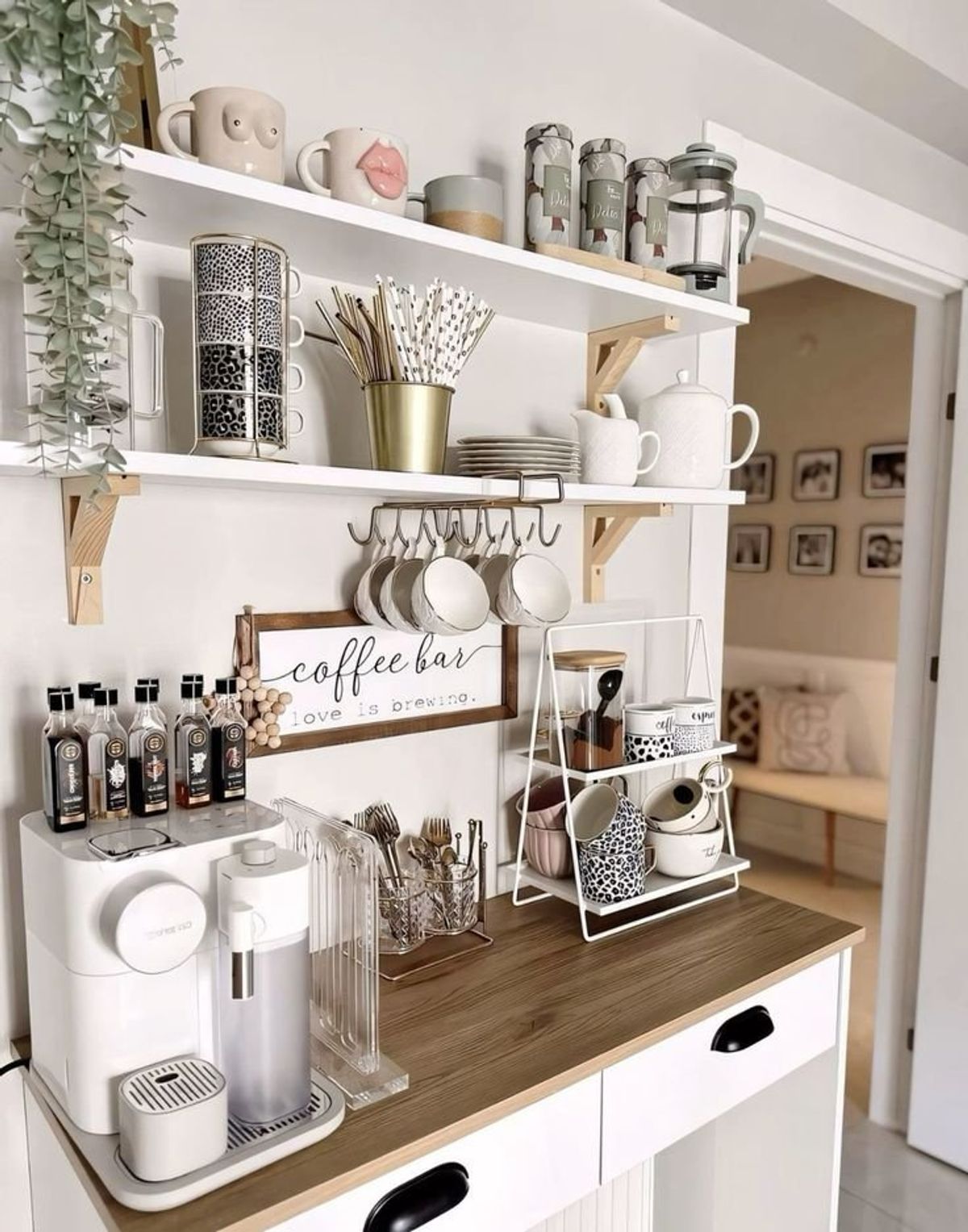 - محل مناسب انتخاب کنید: یک فضای نزدیک به آشپزخانه یا اتاق غذاخوری که دسترسی آسان به لوازم قهوهسازی داشته باشد انتخاب کنید. گوشهای از پیشخوان، دیواری کوچک یا حتی یک تکه مبلمان قدیمی میتواند مکان مناسبی باشد.