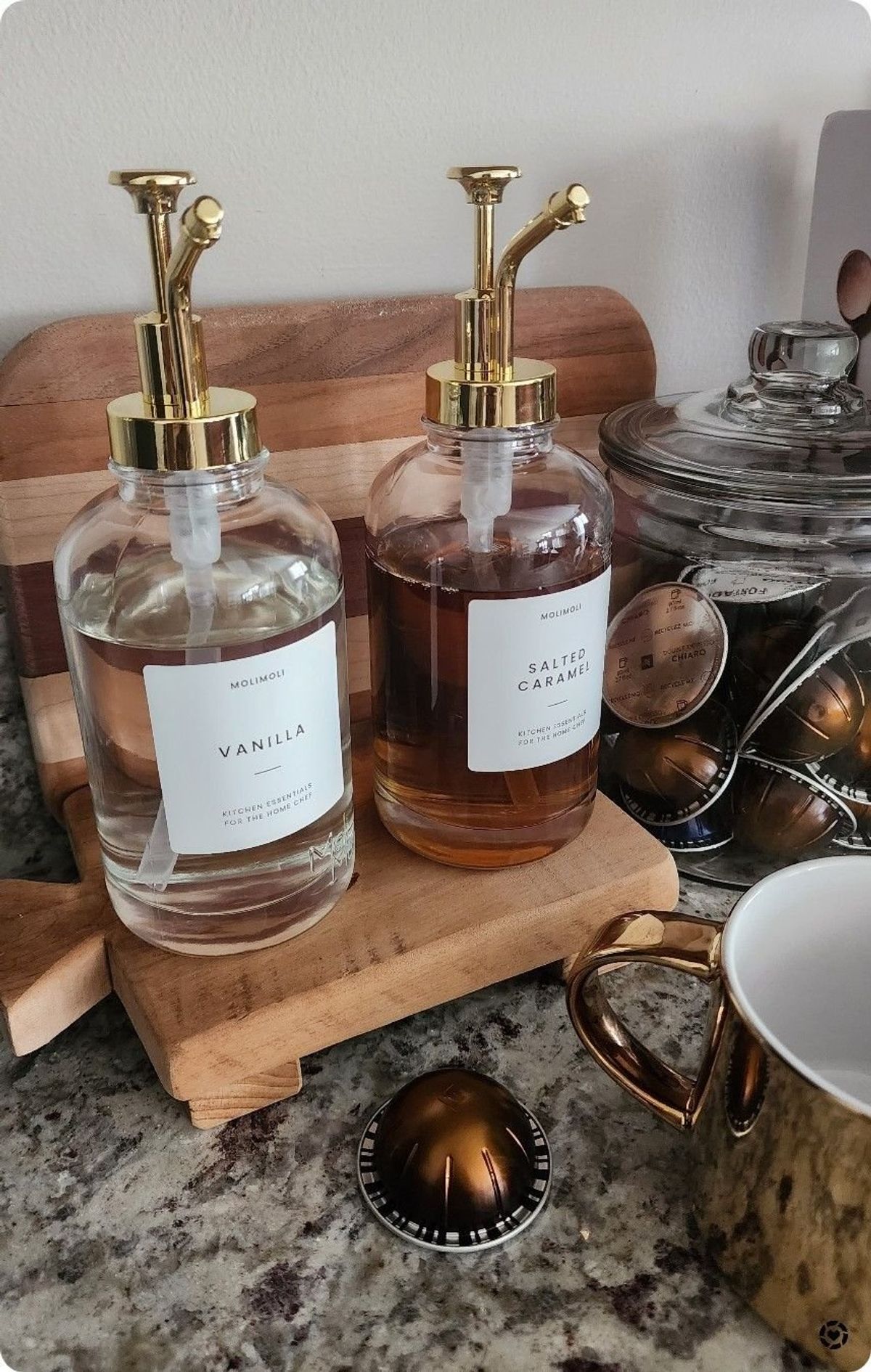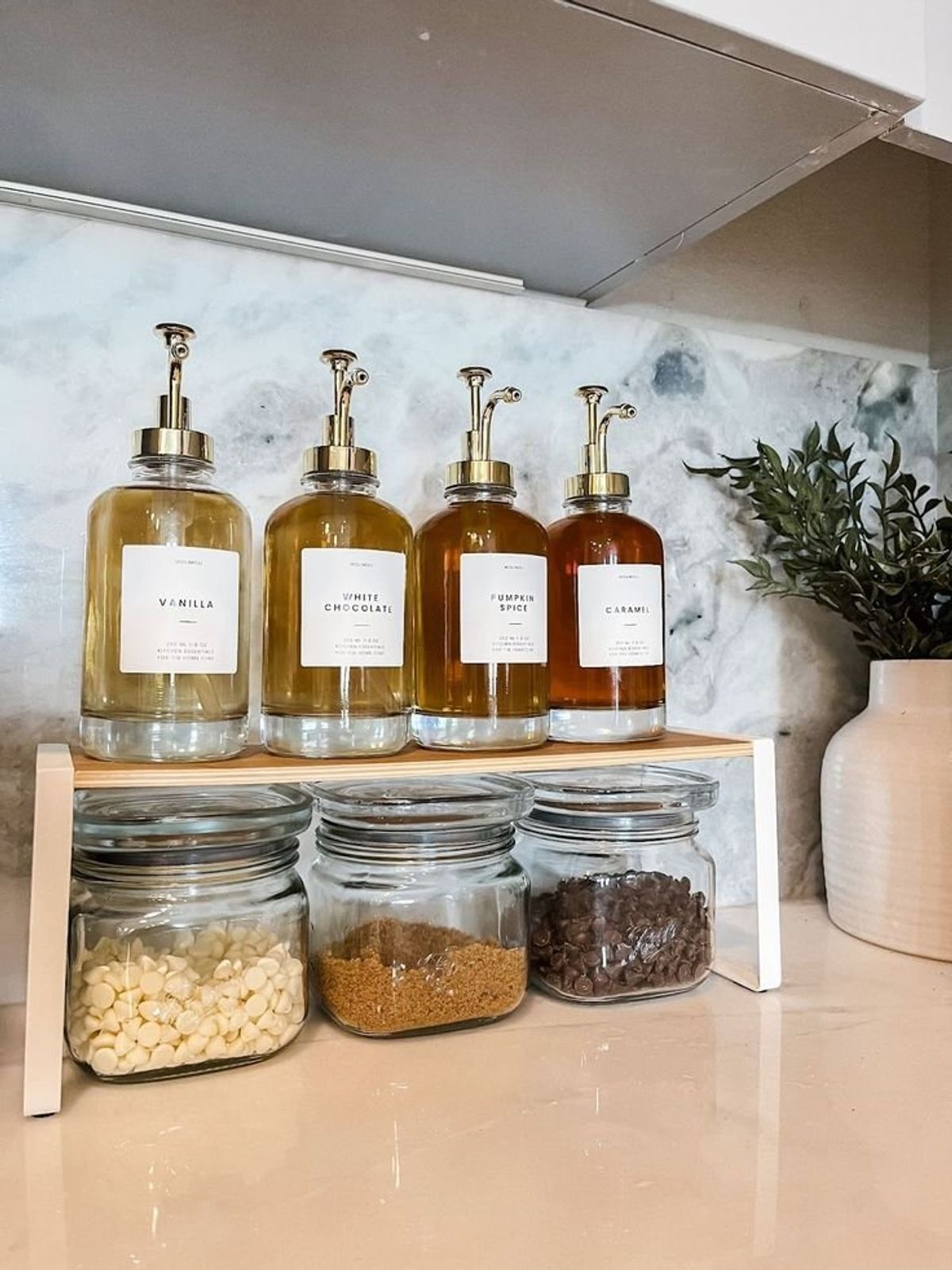 - سیروپهای طعمدار: طعمدهندههای مختلف را در شیشههای پمپی یکشکل قرار دهید تا حس استارباکس را به خانه بیاورید.
