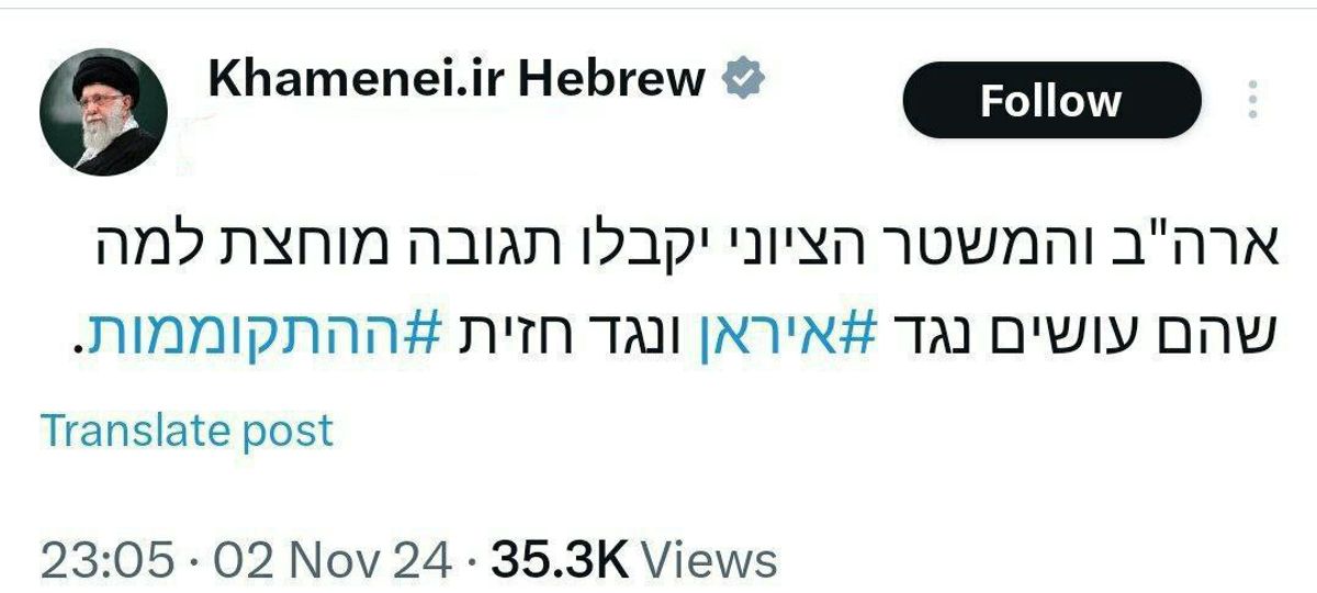 توییت حساب عبری رهبر جمهوری اسلامی: آمریکا و رژیم صهیونیستی پاسخ دندانشکن دریافت خواهند کرد.