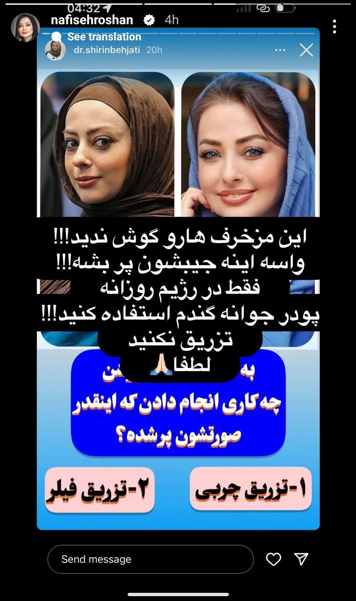 نفیسه روشن با انتشار یک استوری، از سوء استفادههای صفحات مجازی از عکس او برای تبلیغ تزریقهای زیبایی انتقاد کرد.