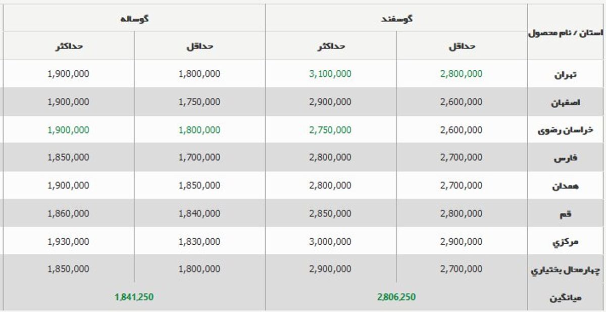 گزارشها نشان میدهد که در استان تهران قیمت دام زنده بالا رفت. بر همین اساس، هر کیلو گوسفند زنده حداقل ۲۸۰ هزار تومان و حداکثر ۳۱۰ هزار تومان قیمت دارد. هر کیلو گوساله زنده نیز بین ۱۸۰ تا ۱۹۰ هزار تومان به فروش میرفت.