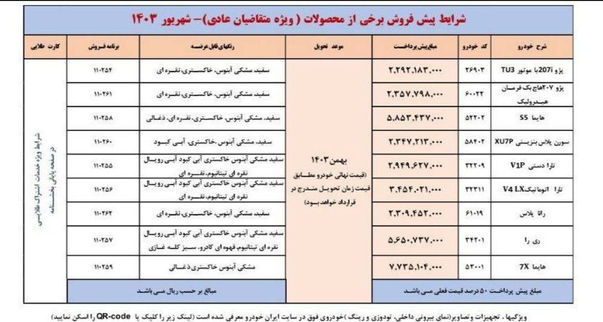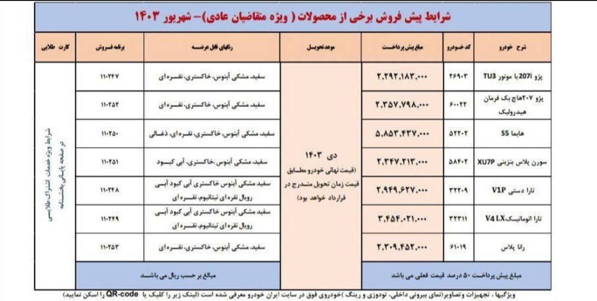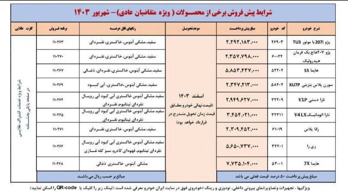 بر این اساس منتخبان مشمول و حائز شرایط اولویتهای اول تا سوم (دی تا اسفندماه سال جاری) که منتخب طرح پیشفروش عادی هستند و پیامک دریافت کردهاند، میتوانند طبق جدولهای مربوط به خود، بر اساس نوع خودرو، وجه پیشپرداخت خودروی خود را واریز کنند.