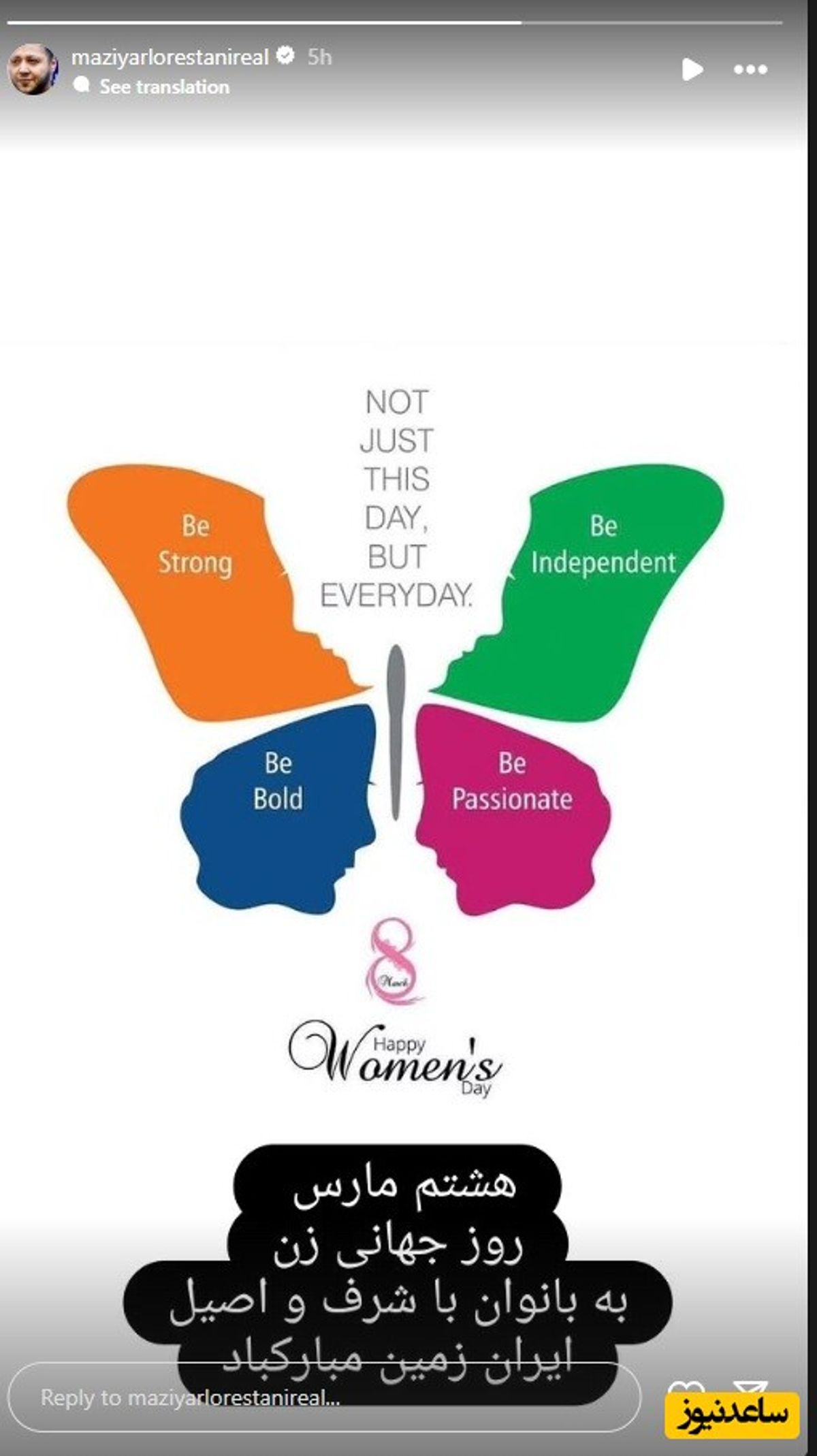 استوری معنادار مازیار لرستانی به مناسبت روز جهانی زن