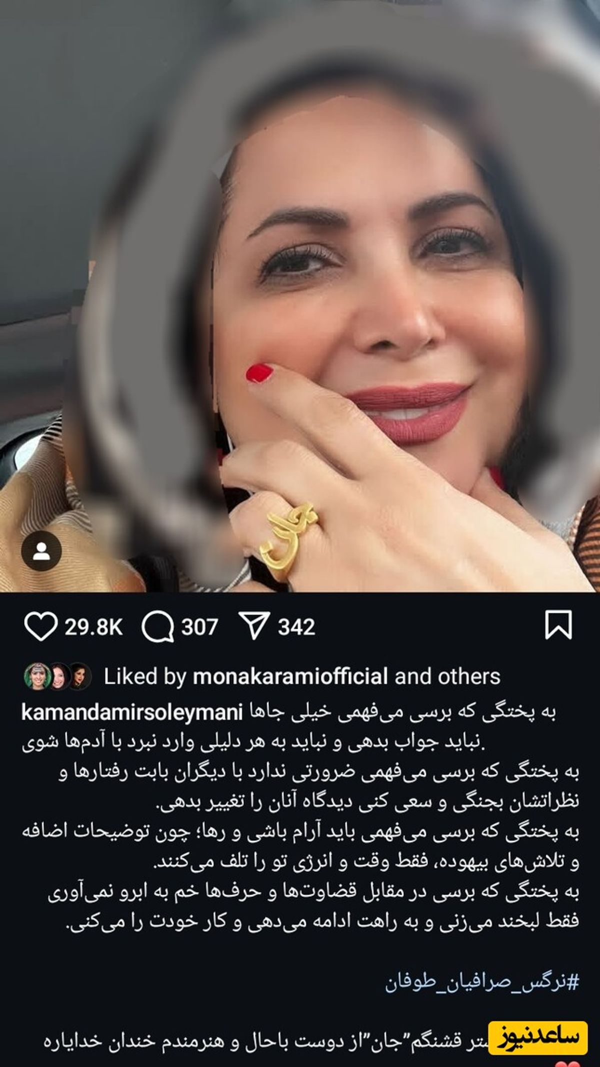 کمند امیر سلیمانی، بازیگر زن سینما دریک پست اینستاگرامی متنی زیبا از نرگس صرافیان با مضمون پند و اندرز منتشر کرد که در ادامه میبیند