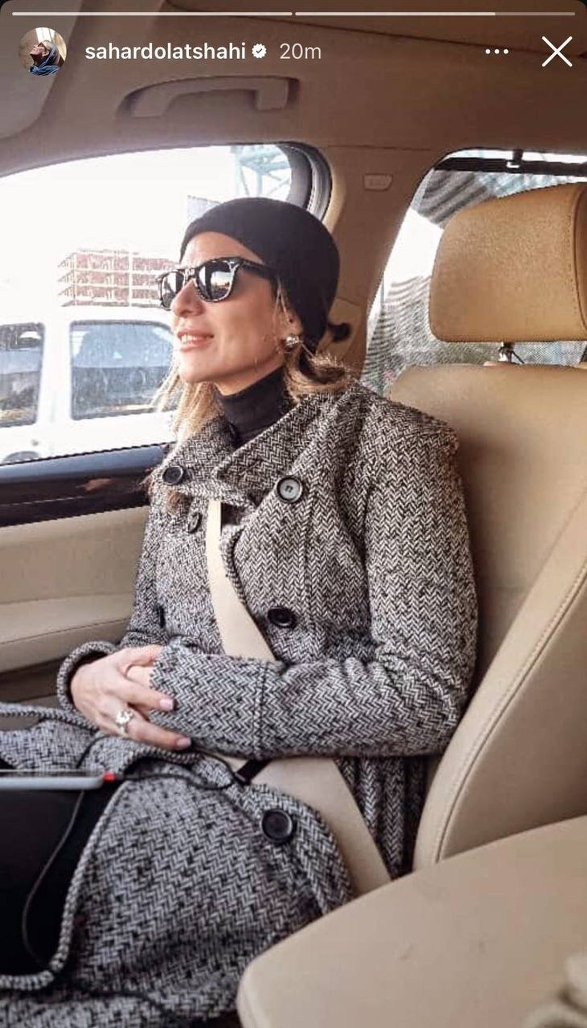استوری جدید سحر دولتشاهی با استایل اروپایی در داخل خودرو | تیپ جذاب سحر دولتشاهی با پالتو جناقی طوسی