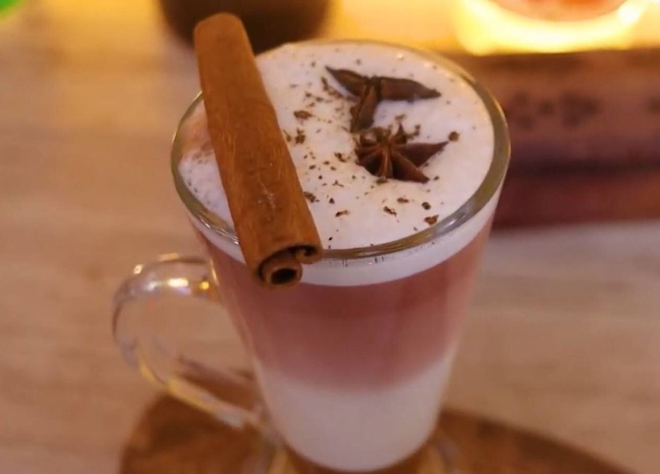 شیر فوم دار را به آن اضافه کنید و در نهایت ترکیب چای صورتی را روی آن بریزید و روی آن را با پودر دارچین و شکلات یا کاکائو تزیین کنید. نوش جان.