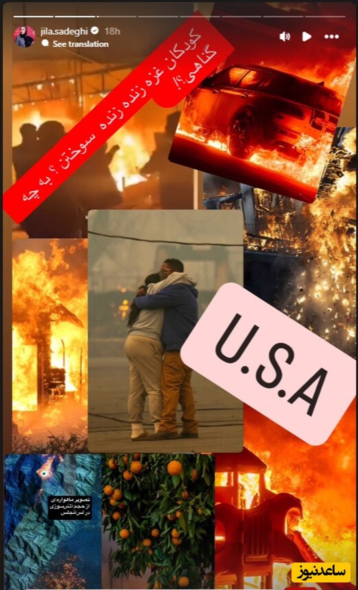 ژیلا صادقی در واکنش به آتش سوزی لس آنجلس تصاویر زیر را در اینستاگرامش استوری کرده است: