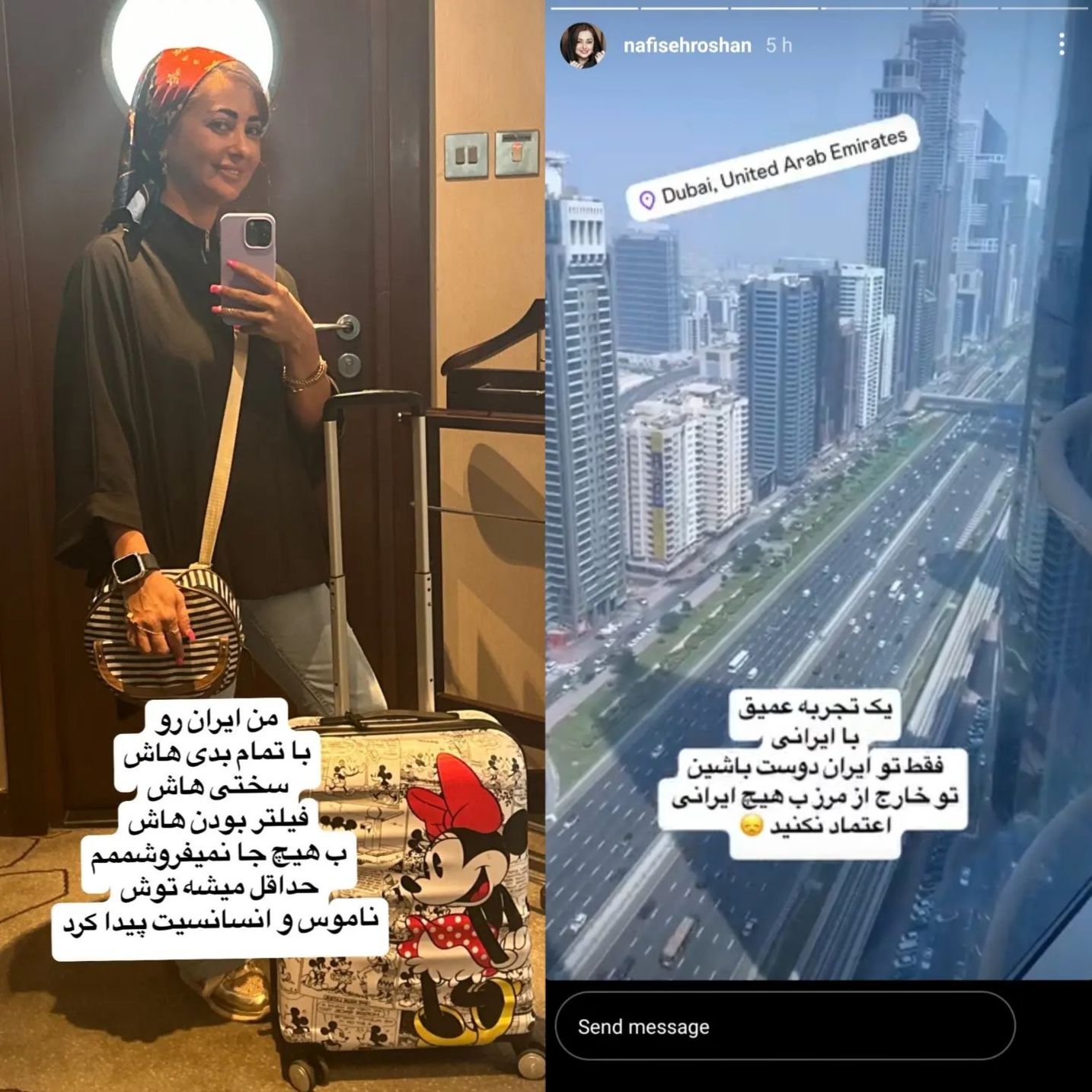 نفیسه روشن نوشت: یک تجربه عمیق با ایرانی فقط تو ایران دوست باشین تو خارج از مرز به هیچ ایرانی اعتماد نکنید من ایران رو با تمام بدی هاش سختی هاش فیلتر بودن هاش به هیچ جا نمیفروشم حداقل میشه توش ناموس و انسانیت پیدا کرد.