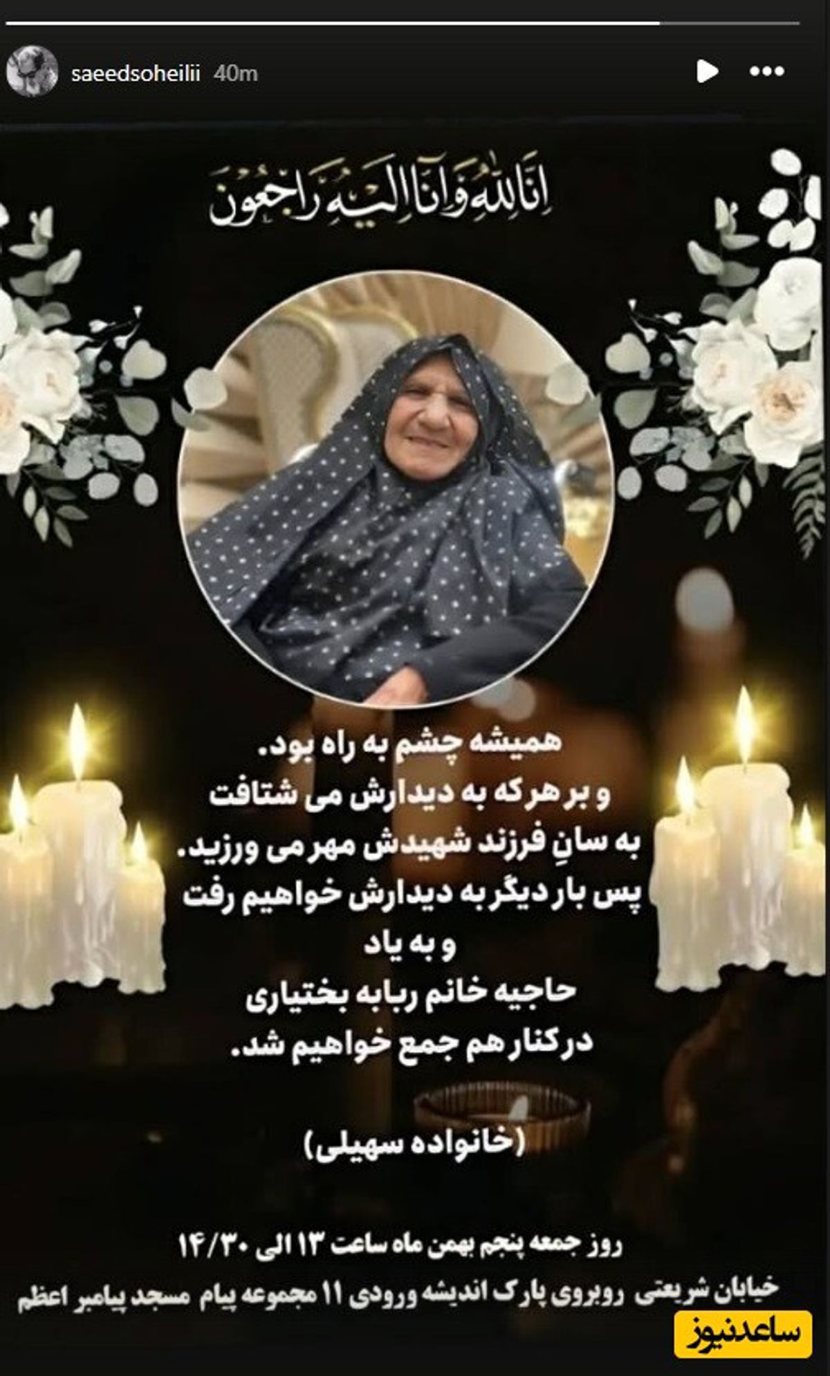 سعید سهیلی؛ پدر ساعد سهیلی از کارگردانان معروف ایرانی میباشد که چند روز پیش مادرشان را از دست دادند. تصویر اعلامیه یادبود این مادر عزیز را مشاهده فرمایید.