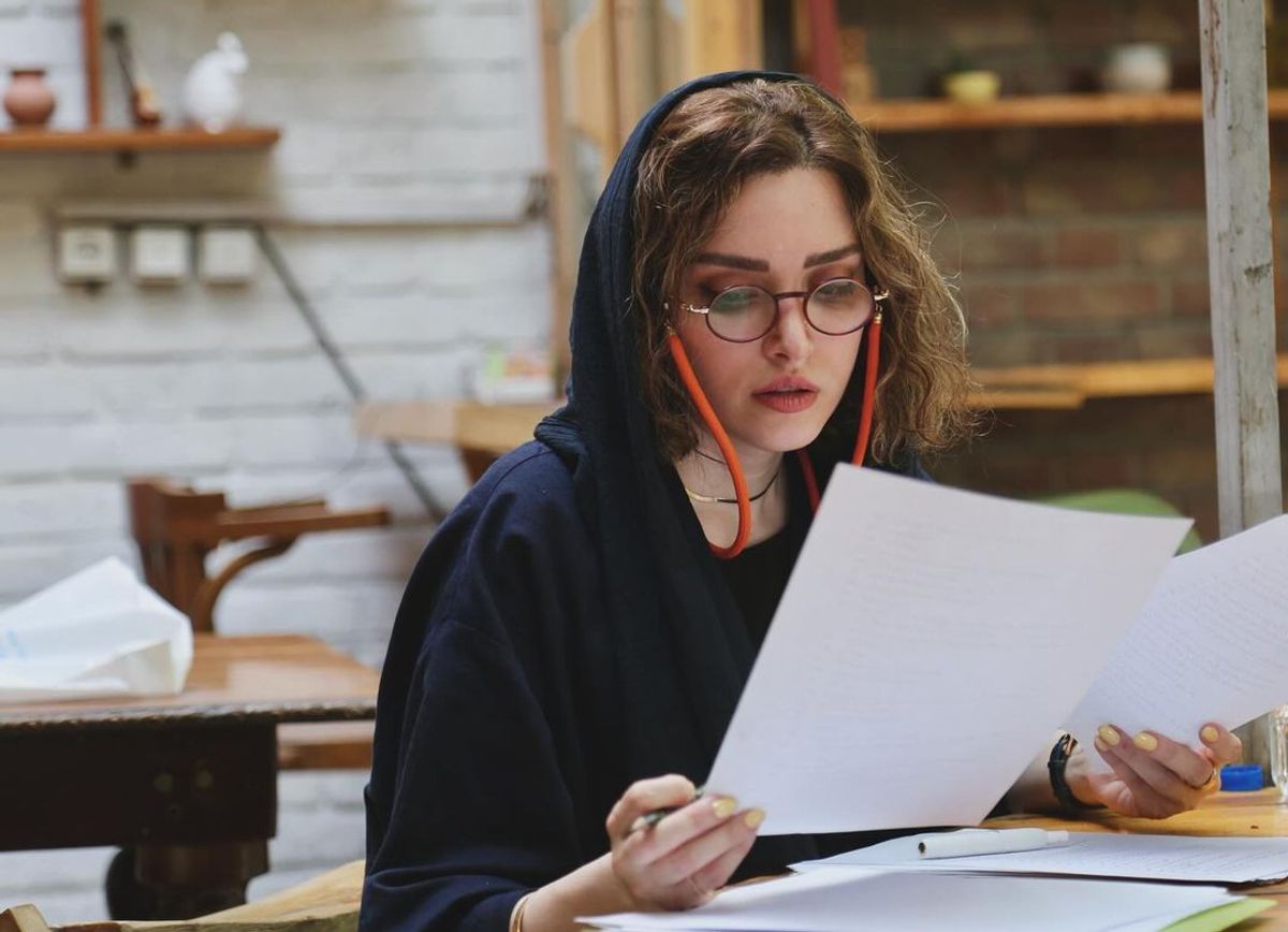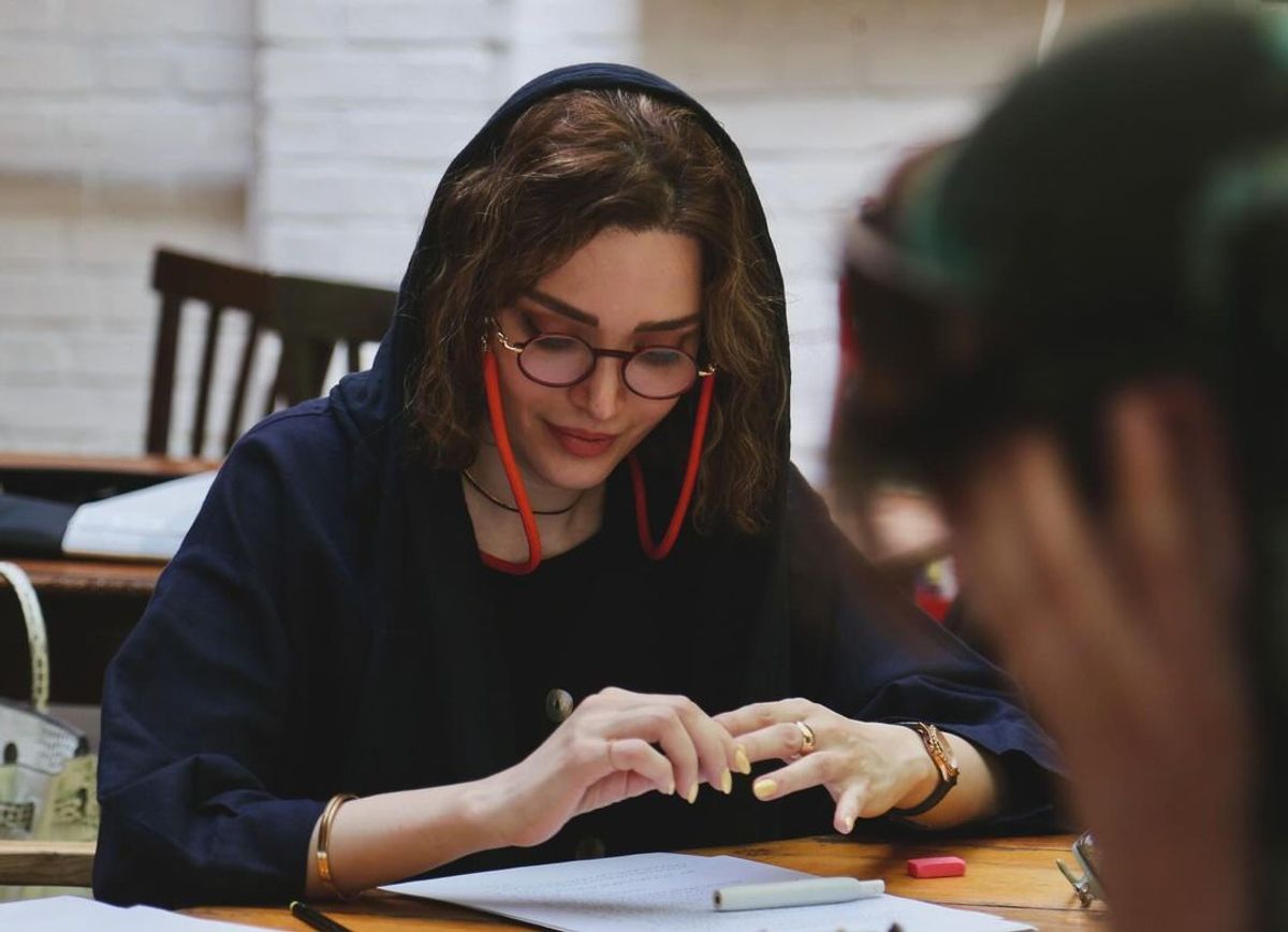 بهنوش طباطبایی با عینک طبی چه خوشگل شده | تصاویری جالب از بهنوش طباطبایی در حال تمرین تئاتر
