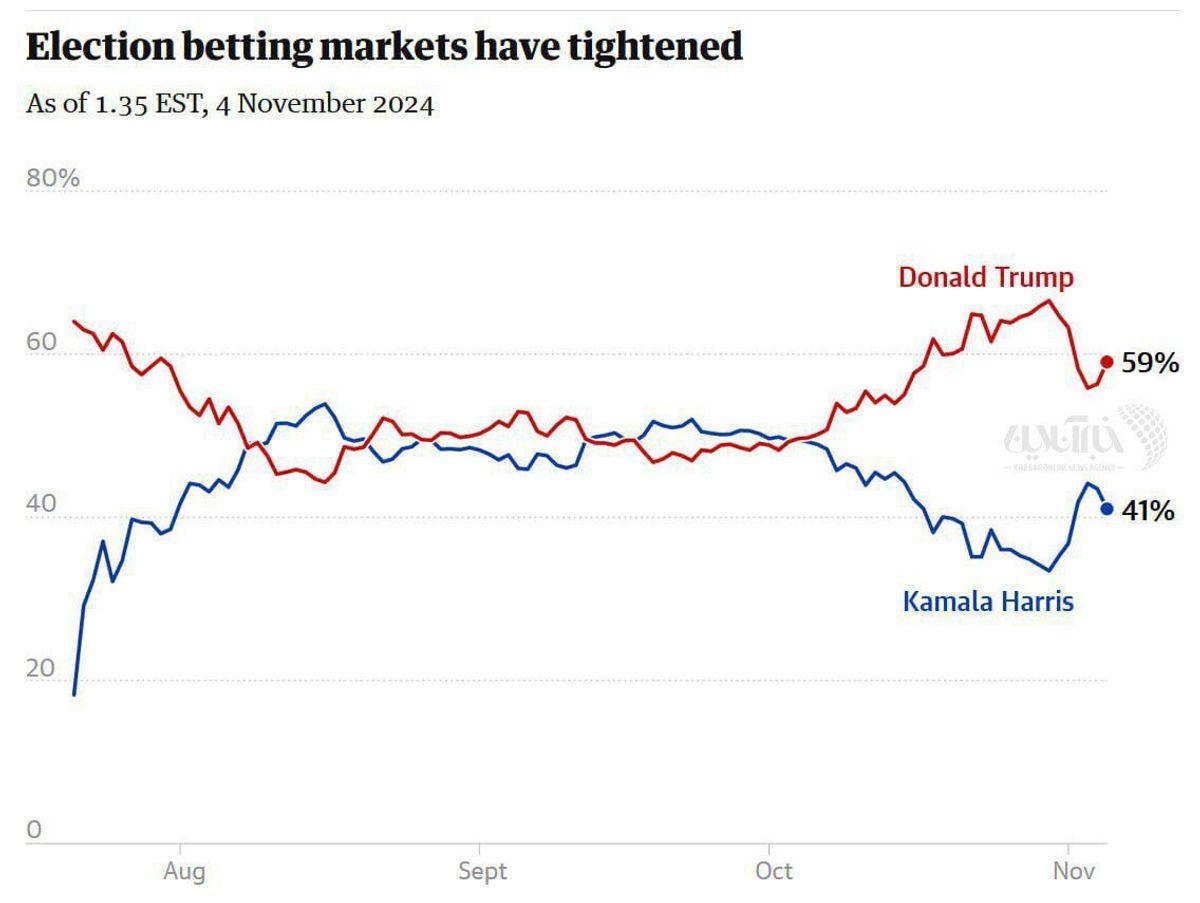 همزمان با آغاز انتخابات آمریکا بازار شرطبندی نتایج آرا نیز داغ شده است. طبق یک نظرسنجی ترامپ با درصد آرای چشمگیری از هریس پیشی گرفته است.
