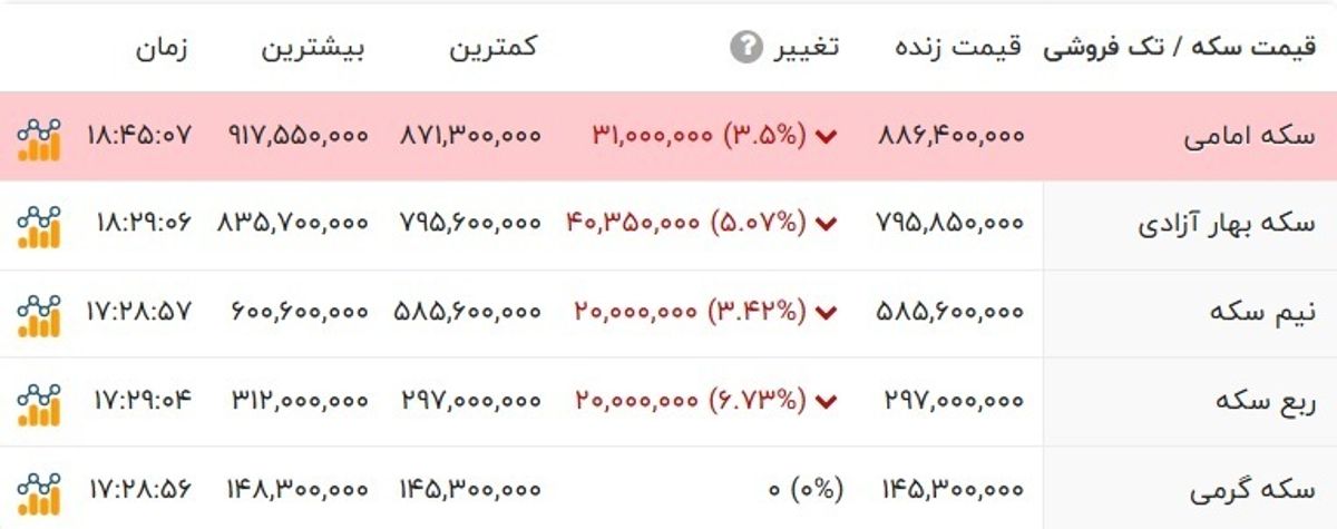سکه امامی با ۳ میلیون و ۱۰۰ هزار تومان کاهش به ۸۸ میلیون و ۶۴۰ هزار تومان قیمت گذاری شد. سکه بهار آزادی با ۴ میلیون و ۳۵ هزار تومان کاهش به ۷۹ میلیون و ۵۸۵ هزار تومان رسید. نرخ نیم سکه و ربع سکه به ترتیب ۵۸ میلیون و ۵۶۰ هزار تومان و ۲۹ میلیون و ۷۰۰ هزار تومان در تابلو اعلان قیمتها نمایان شد.