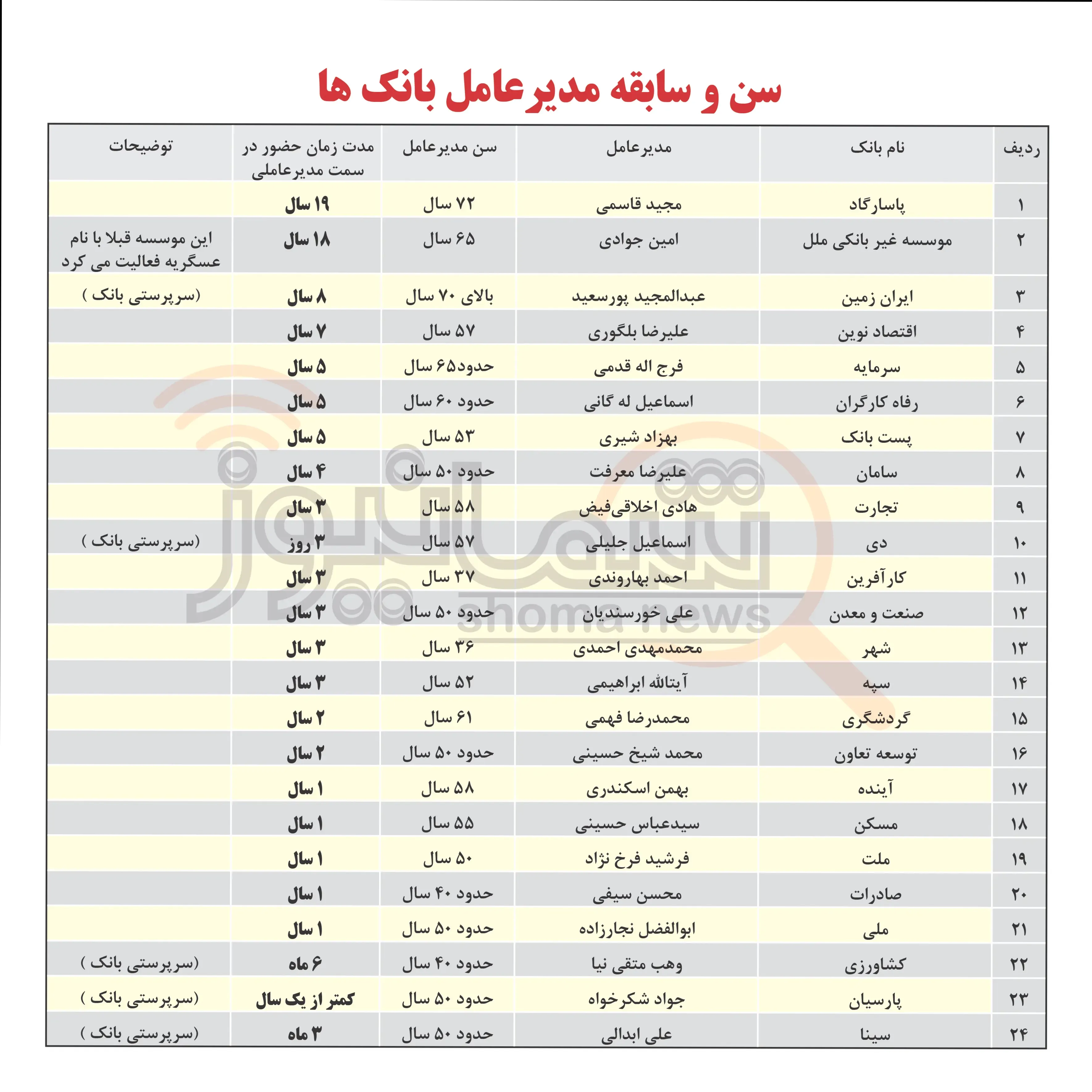 سن برخی از مدیران عامل بانکها حدودی درج گردیده است و اطلاعات کاملی در بیوگرافی موجود نبود.