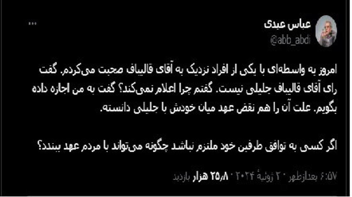 امروز به واسطهای با یکی از افراد نزدیک به آقای قالیباف صحبت میکردم. گفت رأی آقای قالیباف جلیلی نیست. گفتم چرا اعلام نمیکند؟ گفت به من اجازه داده بگویم. علت آن را هم نقض عهد میان خودش با جلیلی دانسته.