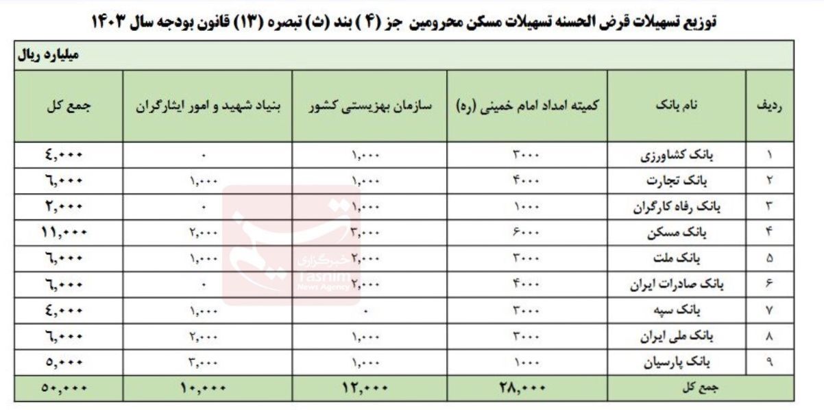 در بخشنامه ابلاغی آمده است: پیرو نامه شماره ۷۲۷/۰۳ مورخ ۰۶/۰۱/۱۴۰۳ پیرامون ابلاغ تسهیلات مسکن محرومین موضوع جز ۴ بند ث تبصره ۱۳ قانون بودجه سال جاری، به پیوست جدول سهیمه آن بانک برای پرداخت تسهیلات بند قانونی مذکور با سقف فردی مبلغ ۴ میلیارد ریال و تاییدیه سامانه رفاه ایرانیان (مبنی بر قرار داشتن این افراد در سه دهک اول درآمدی) جهت استحضار ارسال میشود.