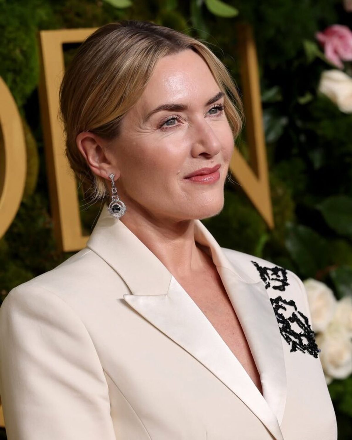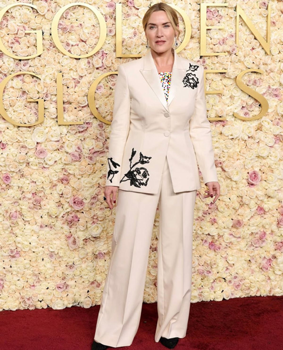 این ستاره سینما با پوشیدن اوتفیتی سفید و درخشان با تزئیناتی مشکی و ملیلهدوزیشده، بر روی فرش قرمز هتل بورلی هیلتون قدم گذاشت. این اوت فیت شامل یک کت و یک شلوار سفارشی بود که هر دو از جنس ساتن ابریشمی بودند. وینسلت برای ظاهری جسورانهتر، بدون پیراهن ظاهر شد. در شانه راست کت و قسمت پایینی سمت چپ آن طرح یک گل رز دیده میشد. بسیاری از کاربران بر این باور بودند که این گل رزها به نام او در فیلم «تایتانیک» یعنی رز اشاره داشتهاند.