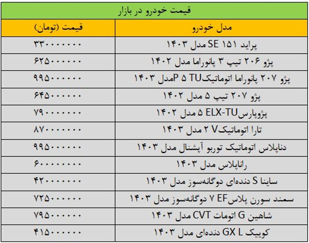 قیمت خودرو امروز یکشنبه 3 شهریور 1403 | پراید، ساینا، شاهین، رانا و تارا ازان شدند +جدول
