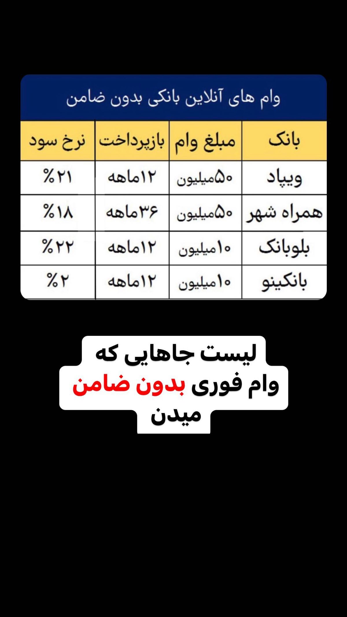 در جدول زیر فهرست این وام ها همراه با نرخ سود آنها آمده است. برای جزئیات بیشتر باید به خود بانک ها مراجعه نمایید.