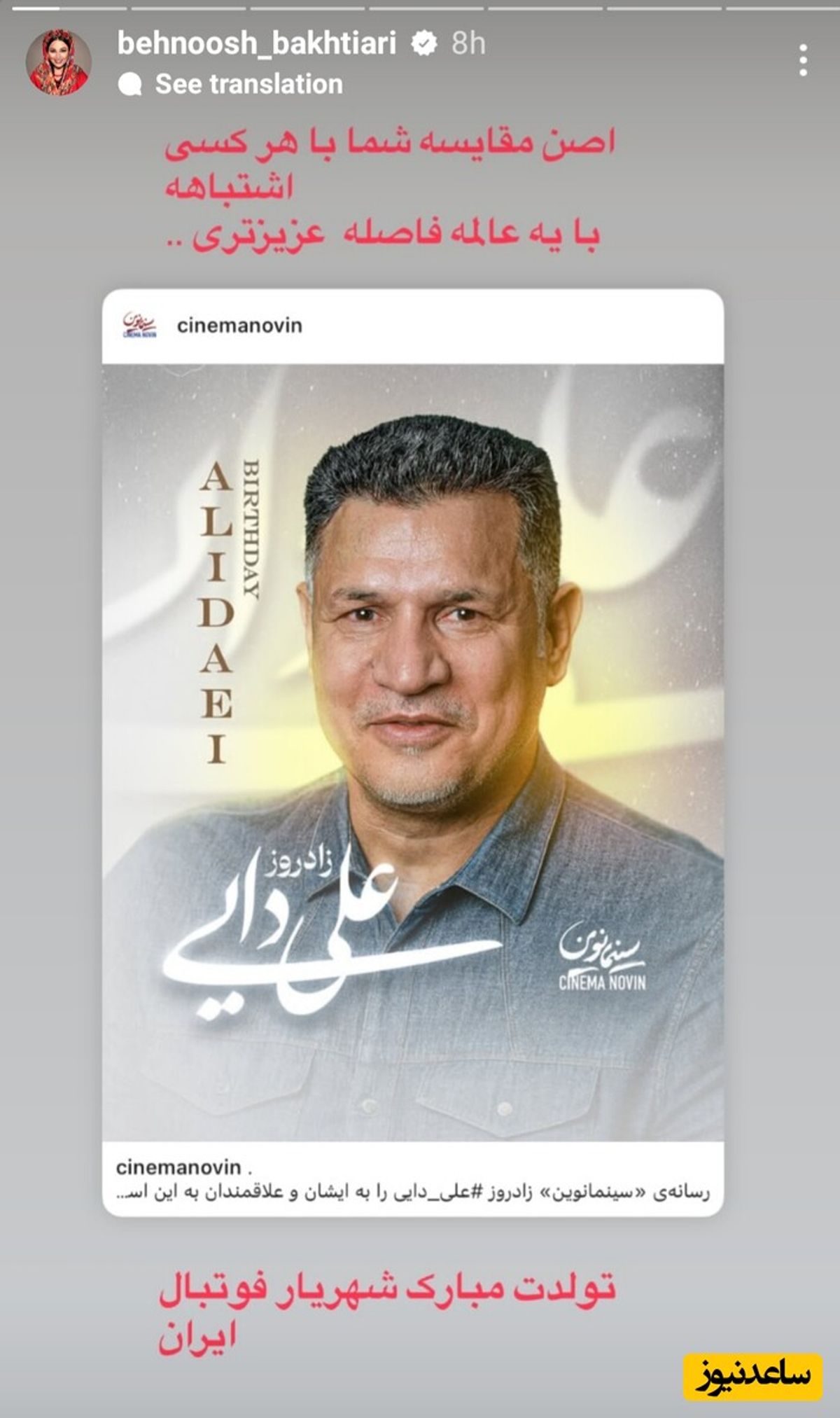 تبریک متفاوت بهنوش بختیاری به علی دایی: مقایسه شما با هیچکس ممکن نیست