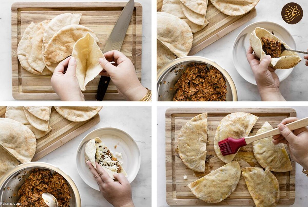 نان پیتای گرد را از وسط برش بزنید و به چهار قسمت مساوی تقسیم کنید که هر قسمت شبیه برش پیتزا حالت مثلثی داشته باشد. حالا لای نان را از یک سمت نوک مثلثی باز کنید و یک قاشق سرپر از موادی را که آماده کردهاید، داخل لایه نان بگذارید و دو لایه را خوب به هم فشار بدهید تا مواد پخش شود. همه تکههای نان را طبق شکل زیر به همین روش آماده کنید.