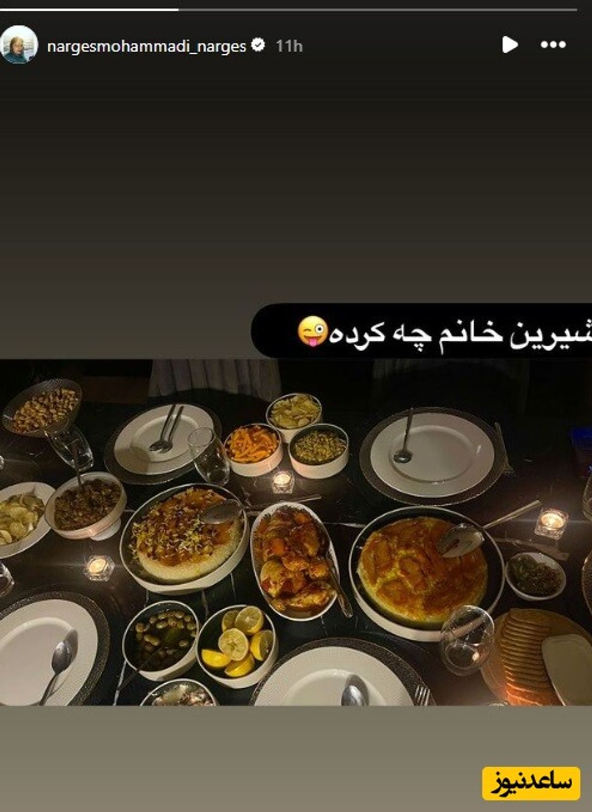 تصویری که نرگس محمدی از میز شامی که دوستش برایشان چیده و در اینستاگرامش استوری کرده است را مشاهده فرمایید.
