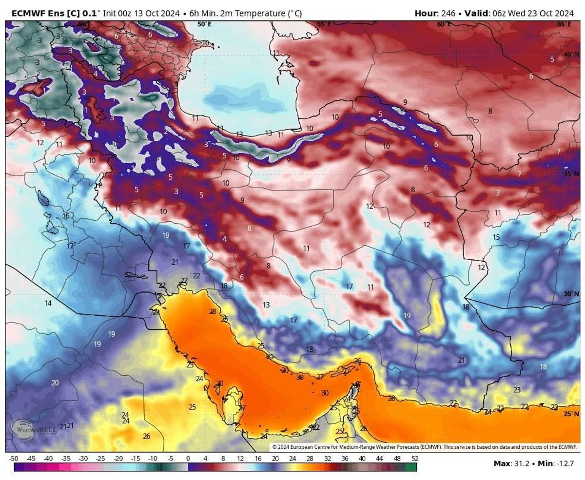 کانال تلگرامی هواشناسی غرب کشور با انتشار تصویری نوشته است: همانطور که در آخرین آپدیت الگوی دمایی مشاهده مینمایید کمینه دمای هوا برای روزهای پایانی هفته آینده به حوالی صفر و حتی زیر صفر خواهد رسید که نشان از شدتگیری کاهش دمای هوا خواهد بود و کمینه دما در نقاطی از استانهای کردستان شمال کرمانشاه و شمال همدان به صفر و حتی زیر صفر درجه نیست خواهد رسید