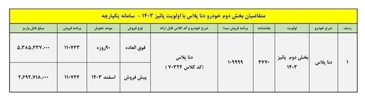 شرایط انتخاب و واریز وجه برای متقاضیان بخش دوم خودروی دنا پلاس با اولویت پائیز ۱۴۰۳ سامانه یکپارچه اعلام شد. متقاضیان میتوانند طی مدت ۱۰ روز با مراجعه به سایت فروش ایران خودرو نسبت به واریز وجه اقدام نمایند.