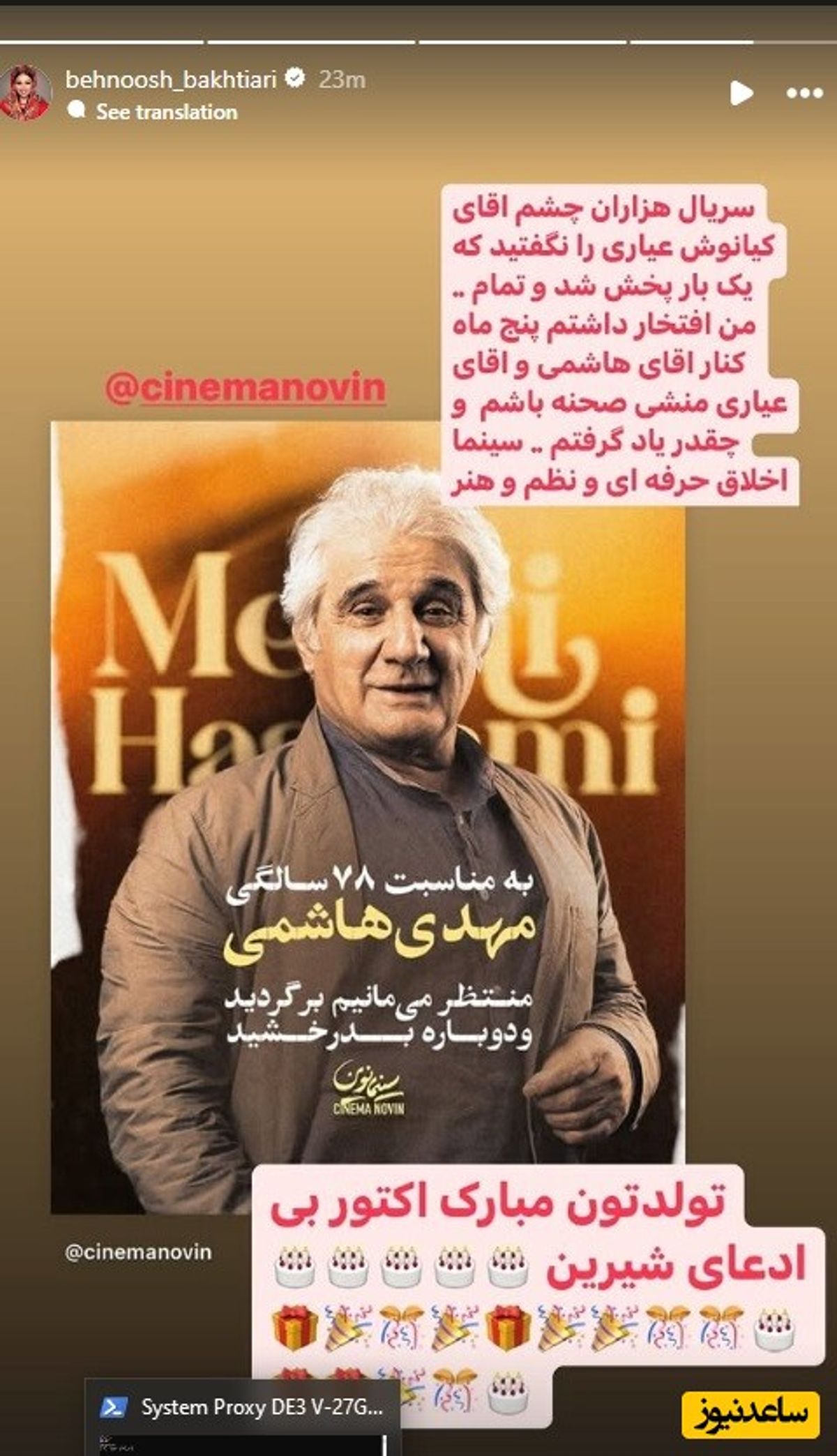 تصویر زیر را بهنوش بختیاری به اشتراک گذاشت و تولد مهدی هاشمی را تبریک گفت: