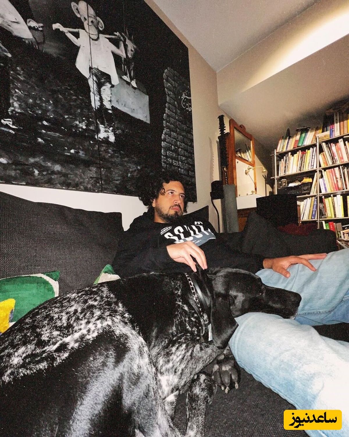 در دکوراسیون منزل مهرداد صدیقیان، مبلمان مشکی، کتابخانهای پُر از کتاب و فضایی مدرن به چشم میخورد. تابلو هنری با تصویر میمون و حضور یک سگ سیاه روی مبل، به فضا جلوهای خاص و متفاوت بخشیدهاند.