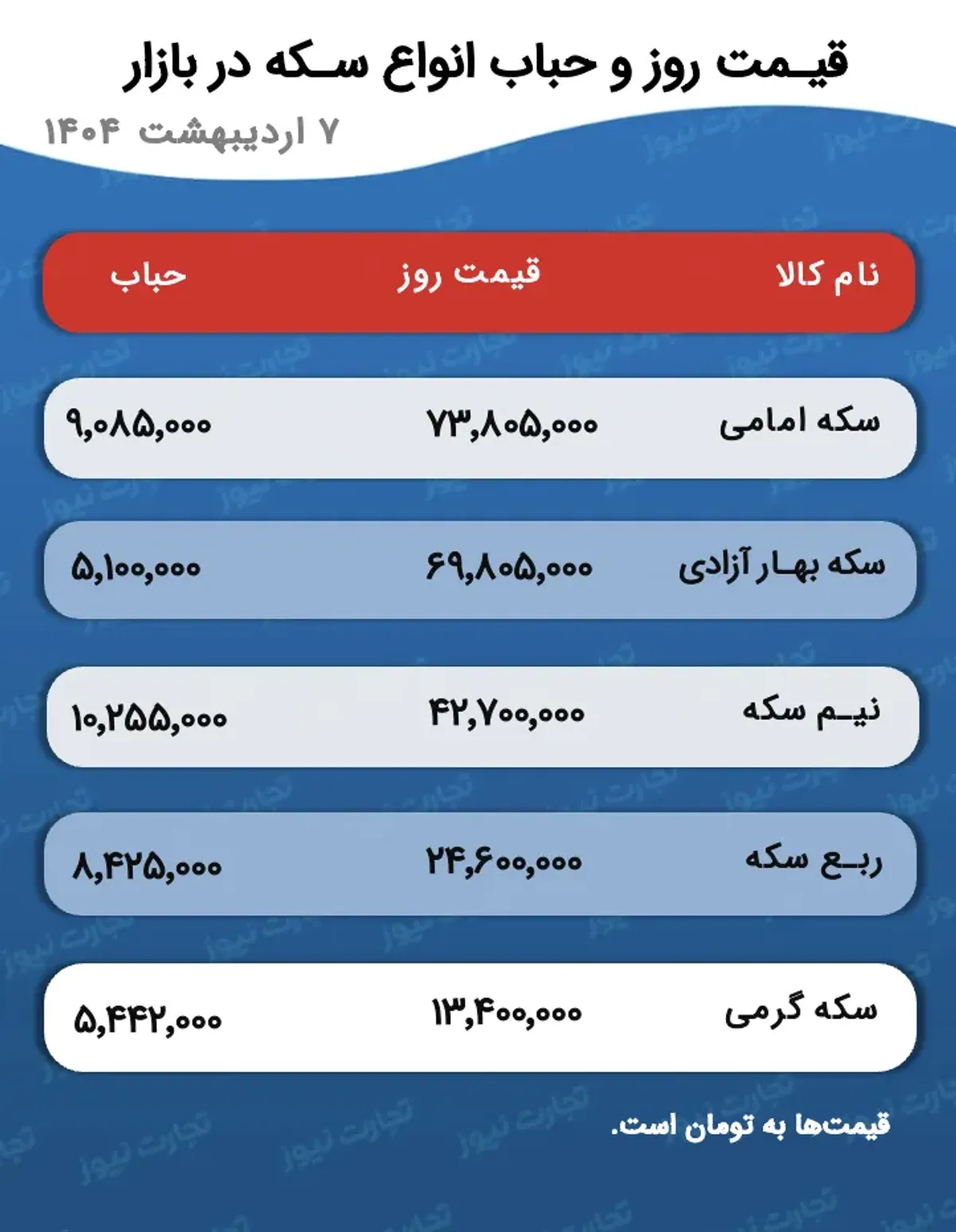 قیمت سکه امامی یکشنبه ۷ اردیبهشت با افت ۲۳۰ هزار تومانی روی رقم ۷۳ میلیون ۸۰۵ هزار تومانی معامله شد. قیمت سکه بهار آزادی با رشد یک میلیون و ۶۸۰ هزار تومانی به کانال ۶۹ میلیونی صعود کرد و روی رقم ۶۹ میلیون و ۸۰۵ هزار تومانی معامله شد.