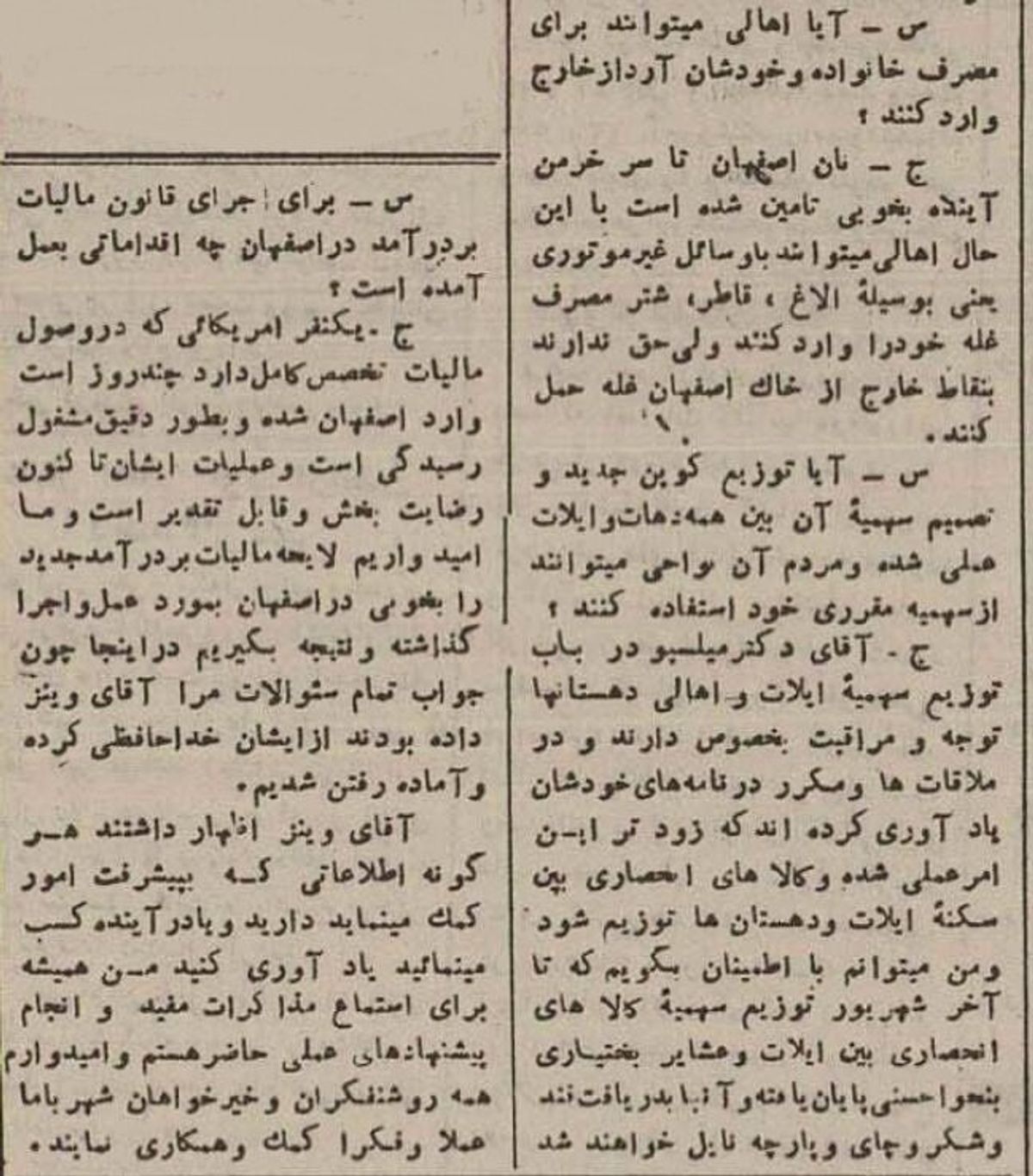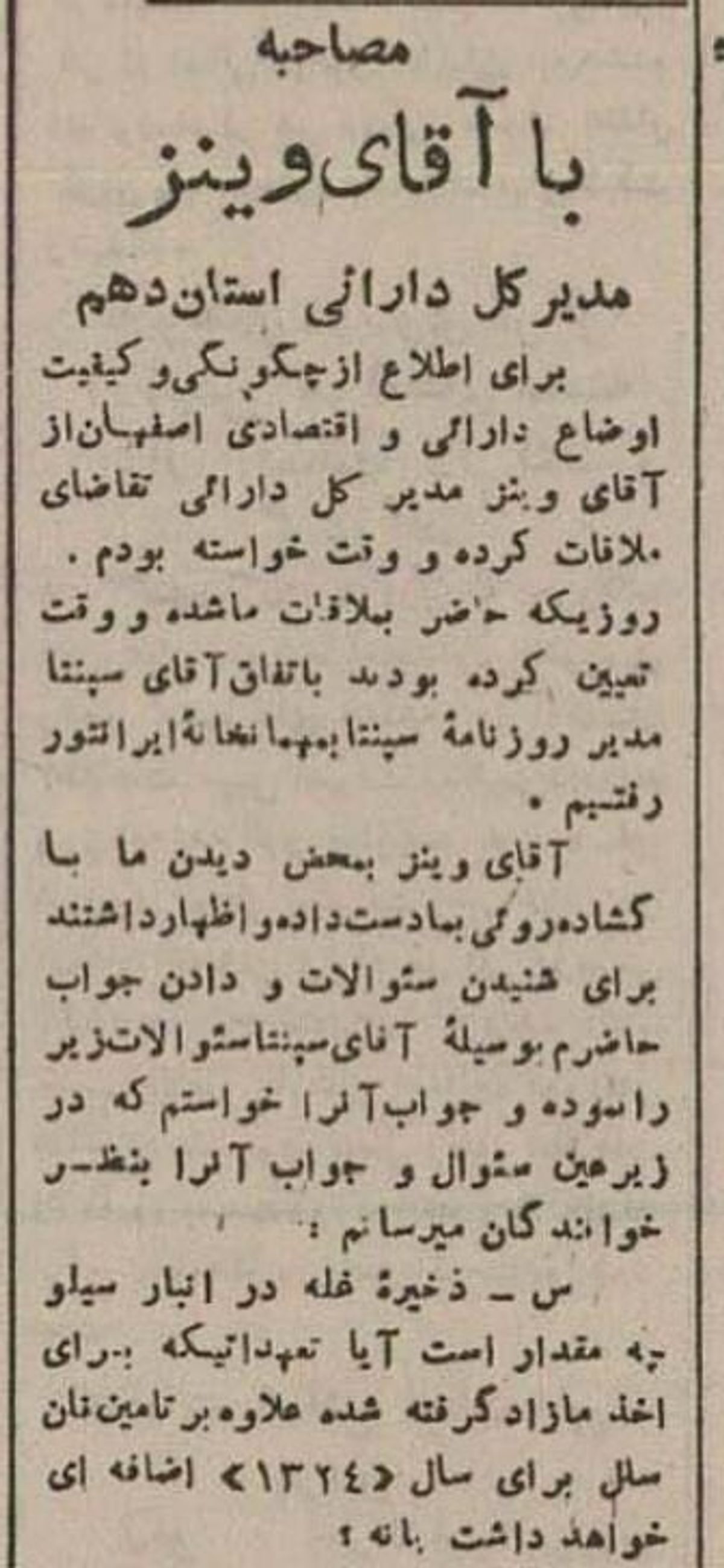 روزنامه اطلاعات ۷ شهریور ۱۳۲۳ با آقای وینز، رئیس دارایی اصفهان درباره وضعیت توزیع نان در این استان گفتوگویی منتشر کرد.