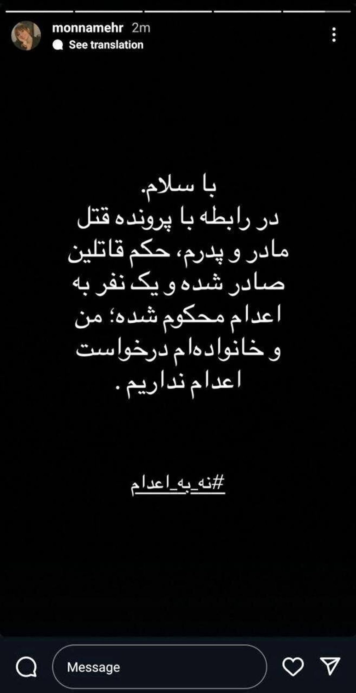 مونا مهرجویی با انتشار استوری در صفحه اینستاگرامش اعلام کرد که با اعدام قاتلین والدینش مخالف است.