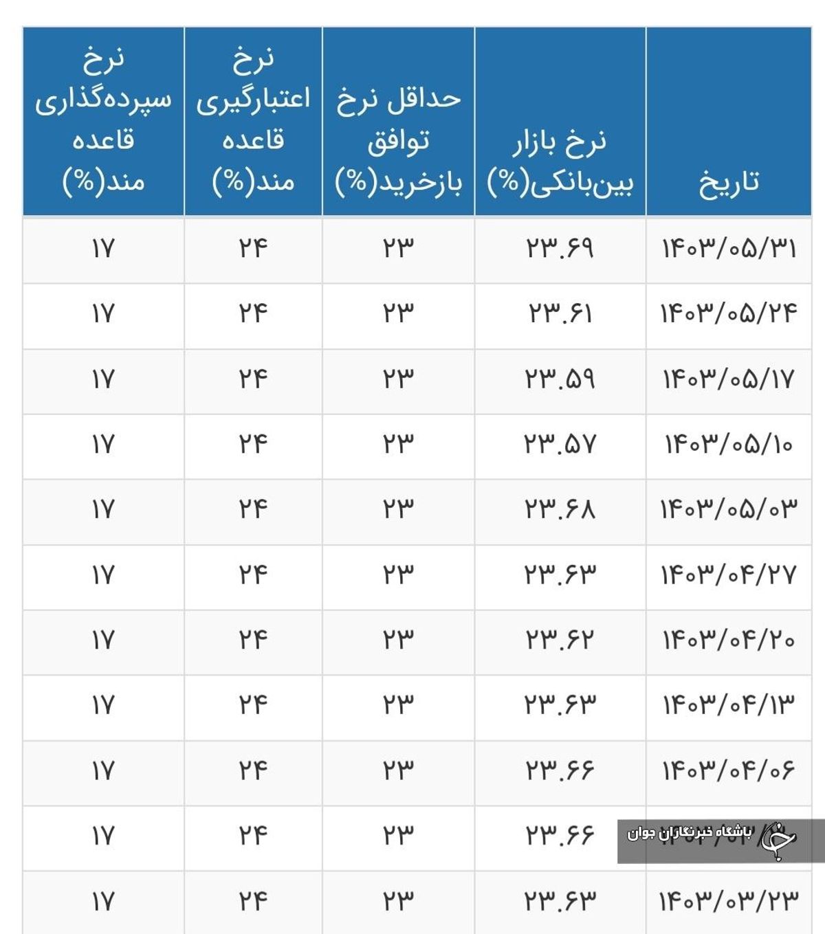 طبق آمار بانک مرکزی میانگین وزنی نرخ بهره بین بانکی در هفتهای که گذشت نسبت به هفته قبلتر از ۲۳.۶۱ درصد به ۲۳.۶۹ درصد در ۳۱ مرداد ۱۴۰۳ رسید.