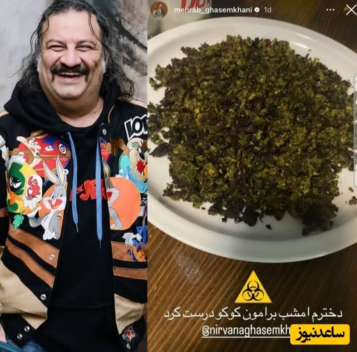 تصویری از بشقاب غذای مهراب قاسم خانی از کوکوی دستپخت دخترش را مشاهده میفرمایید که زیاد هم شکیل نیست.