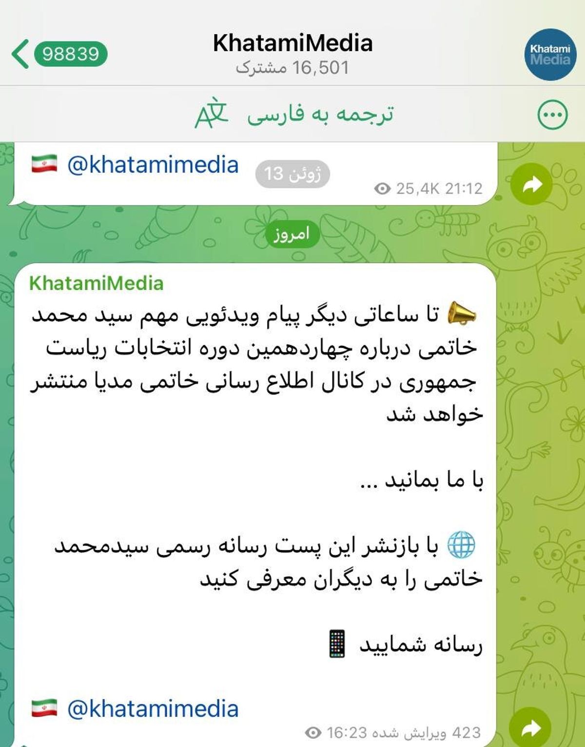 کانال تلگرامی حجت الاسلام سیدمحمد خاتمی نوشت: تا ساعاتی دیگر پیام ویدئویی مهم سید محمد خاتمی درباره چهاردهمین دوره انتخابات ریاست جمهوری در کانال اطلاع رسانی خاتمی مدیا منتشر خواهد شد